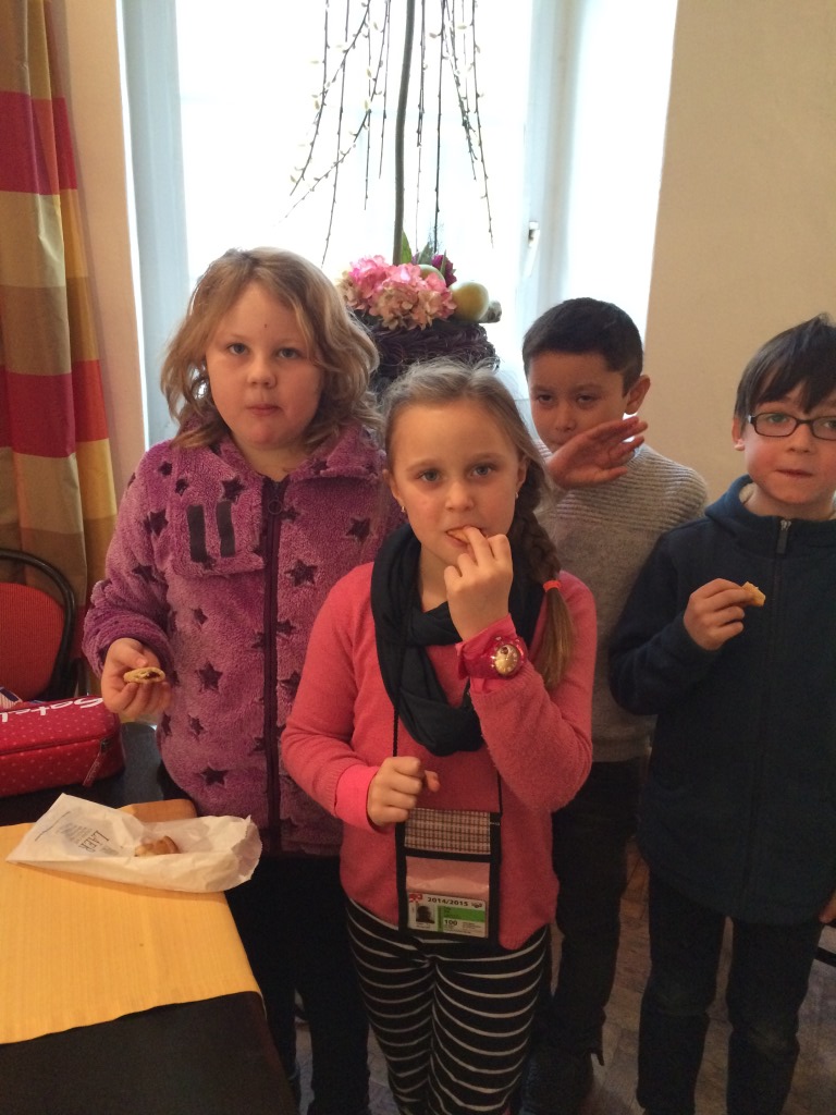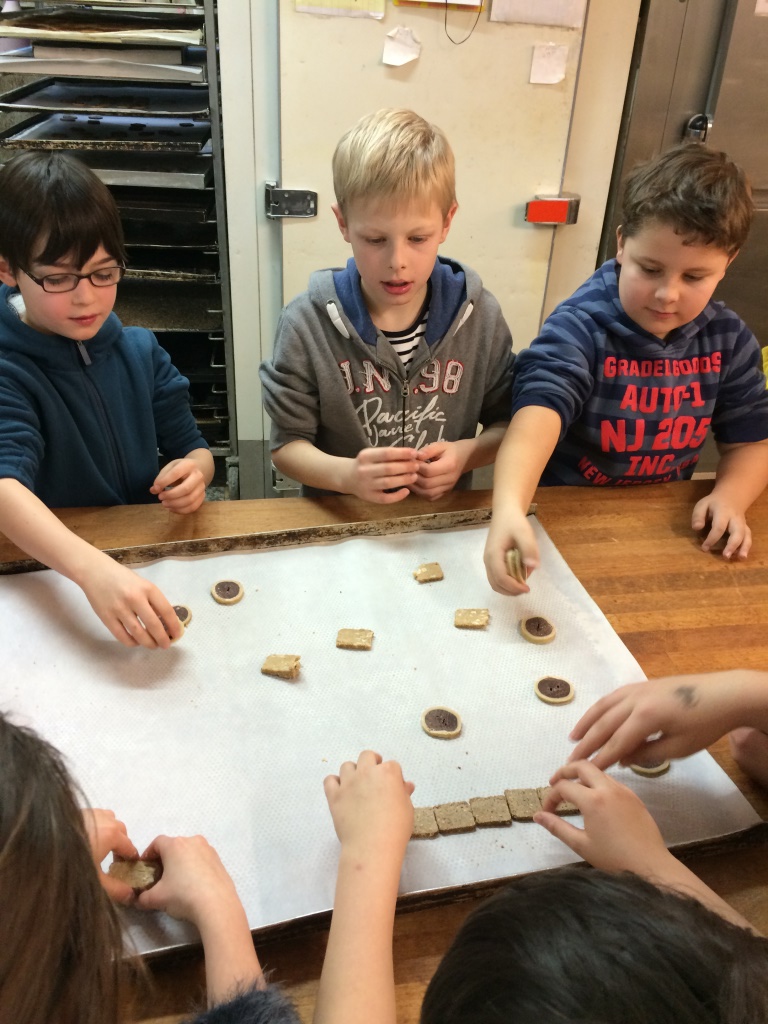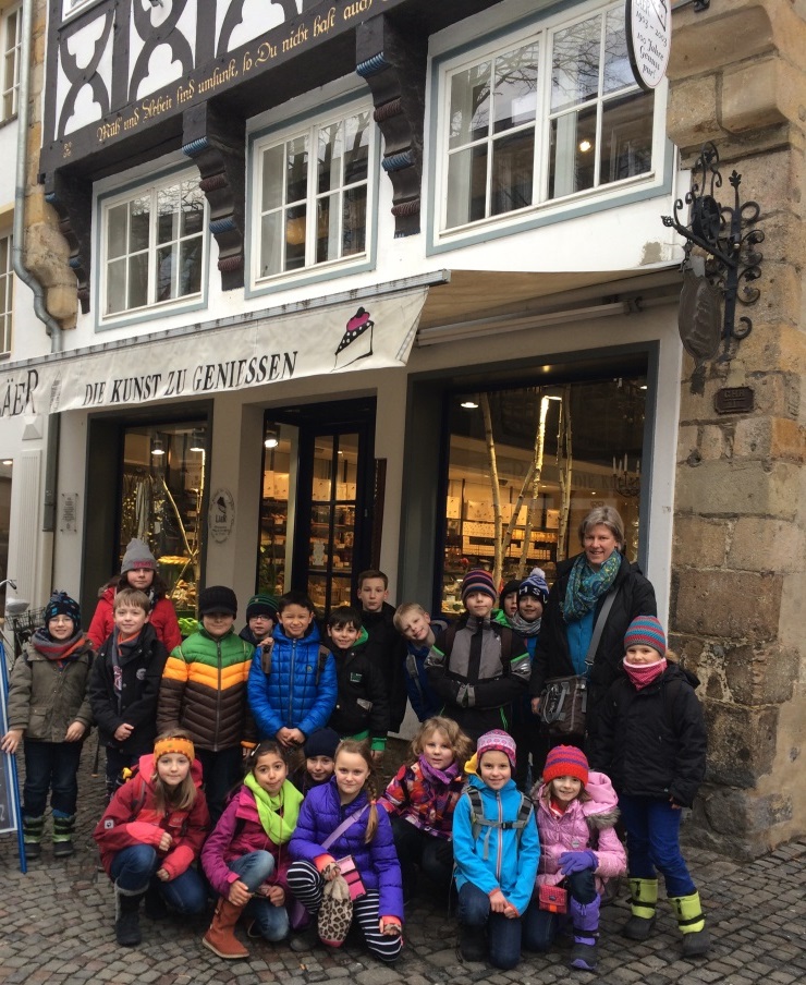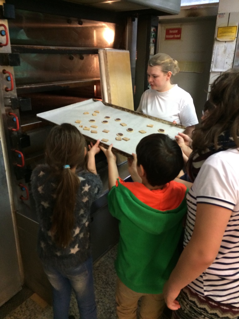 Heute durften wir einen Vormittag in der Bäckerei und Konditorei Läer verbringen. Während einer ganz tollen Führung haben wir immer wieder Fragen gestellt und so viele spannende Dinge rund um die Backstube erfahren. Unter genauer Beobachtung hatten wir den Weg vom Korn zum Mehl, von einem dicken Klumpen Brötchenteig zu den kleinen Brötchen, vom Kuchenteig zu Joghurttörtchen… Mit großen Augen standen wir vor schönen Marzipan- und Sahnetorten, schmecken durften wir die besondere Schokolade und die selbst gemachten Plätzchen. In den Wartezeiten wurde das ein oder andere „Getreide-Buch“ gelesen oder ein kleiner Einkauf im Cafe getätigt. Ein ganz besonderer Schultag 🙂
