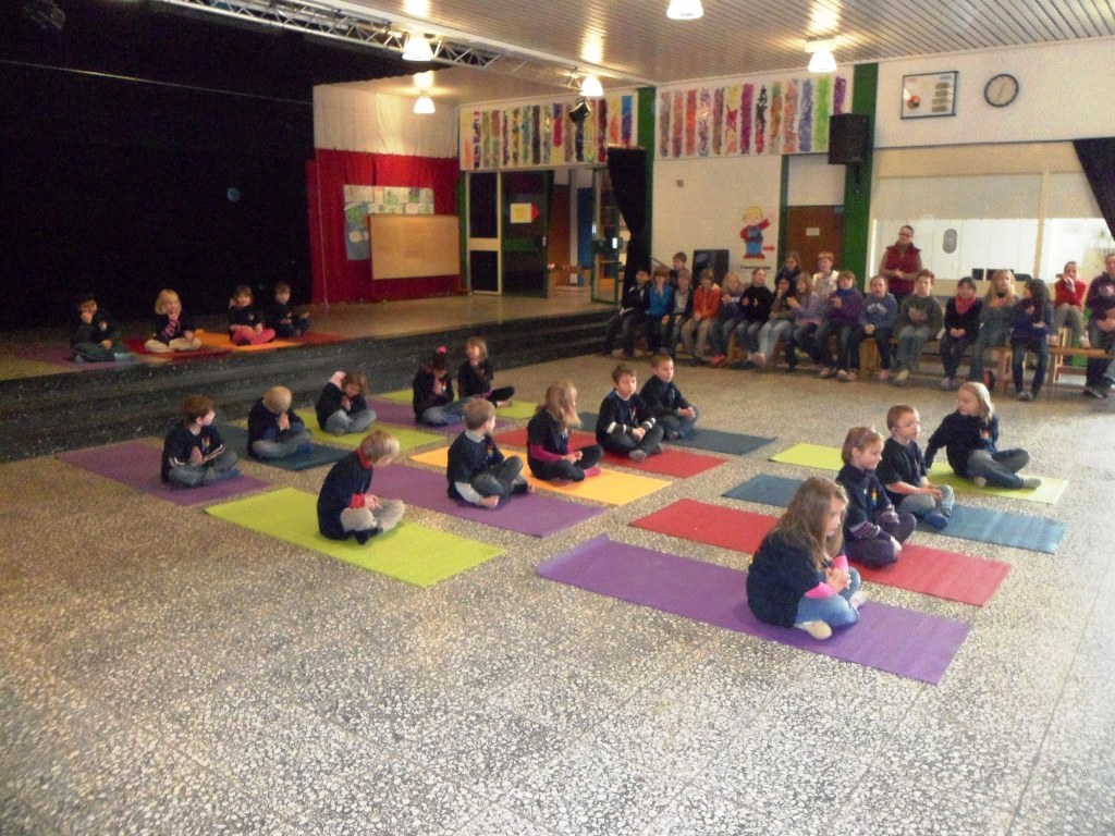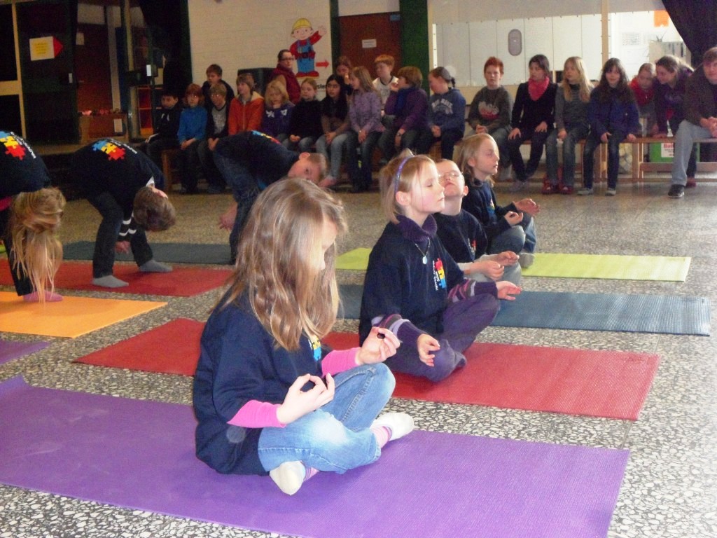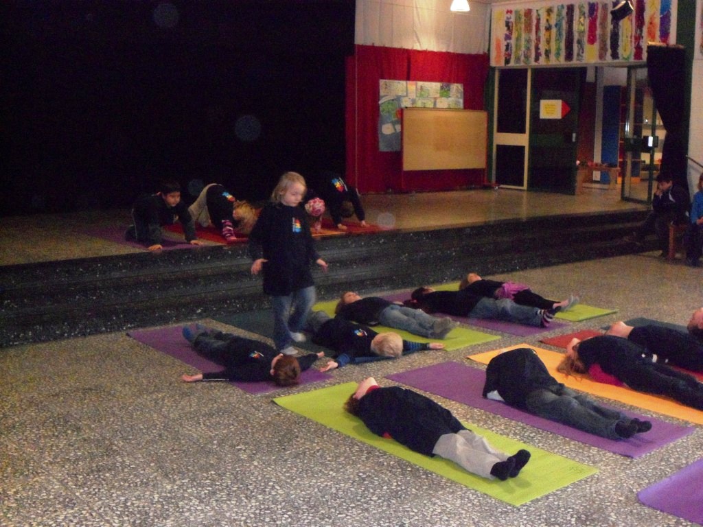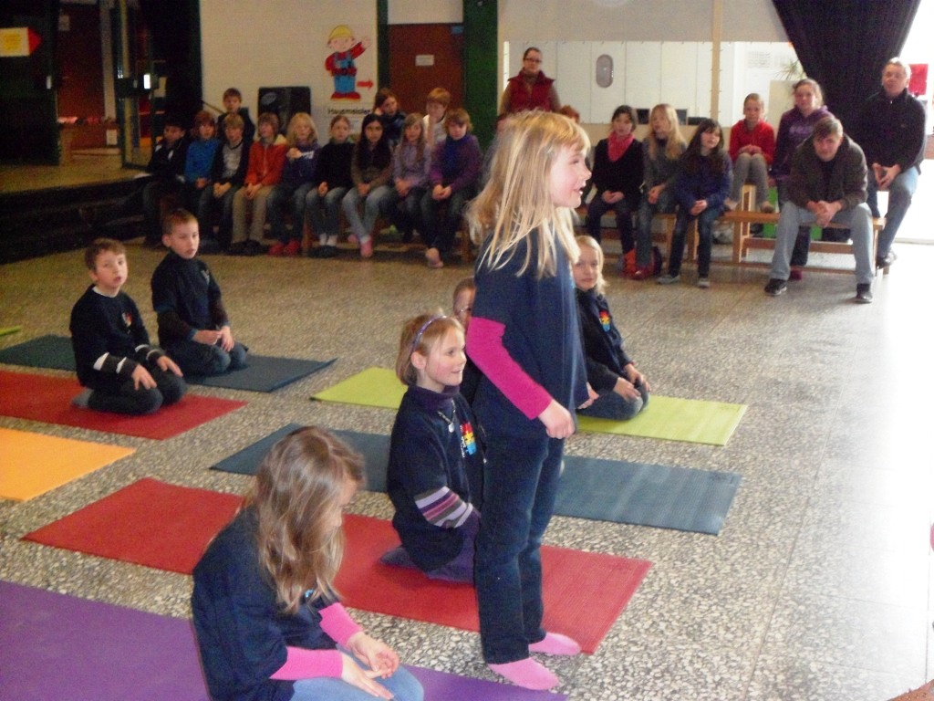 Gut für Körper, Geist und Seele …und auch sehr unterhaltsam für die Zuschauer. Die Klasse 1a zeigte Übungen aus ihrer regelmäßigen Yogapraxis als kleine Geschichte vom verschwundenen Schneeman, der die Welt bereist.