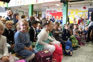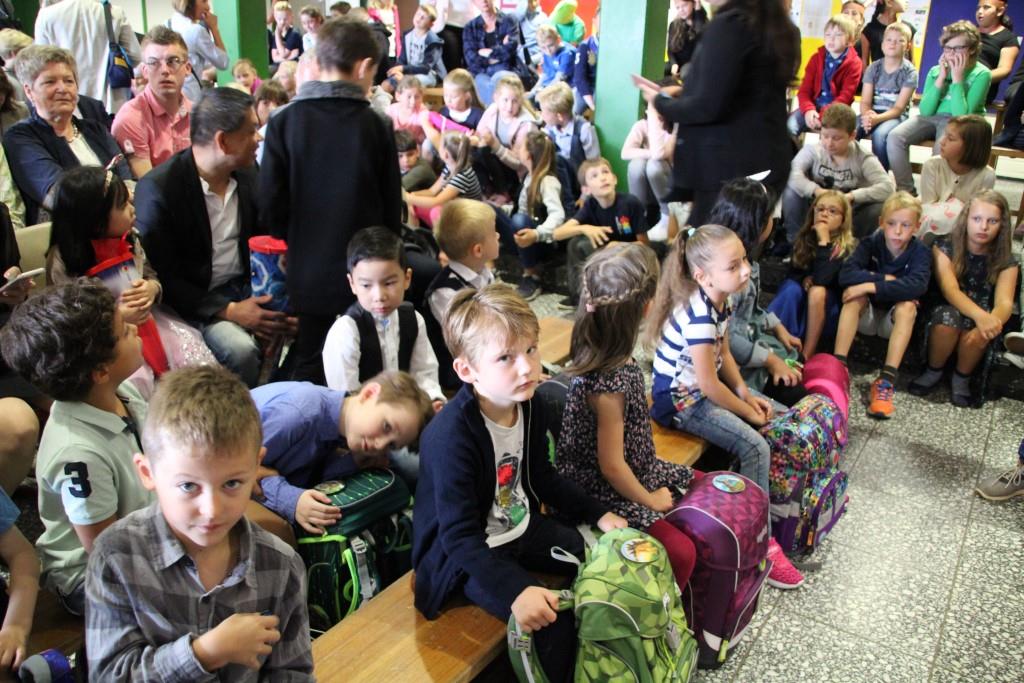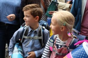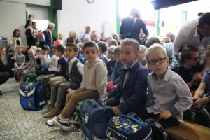 Dann ging es gemeinsam mit den Paten der vierten Klassen in den ersten Unterricht. Ganz viele Sonnenstrahlen begleiteten die Kinder, da sie alle vom Förderverein eine Sonnenblume geschenkt bekamen.