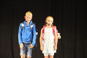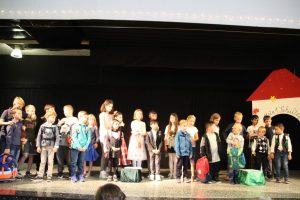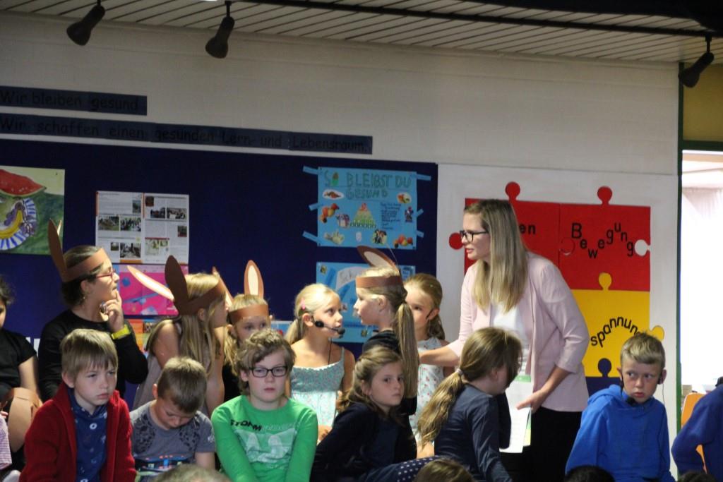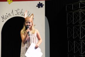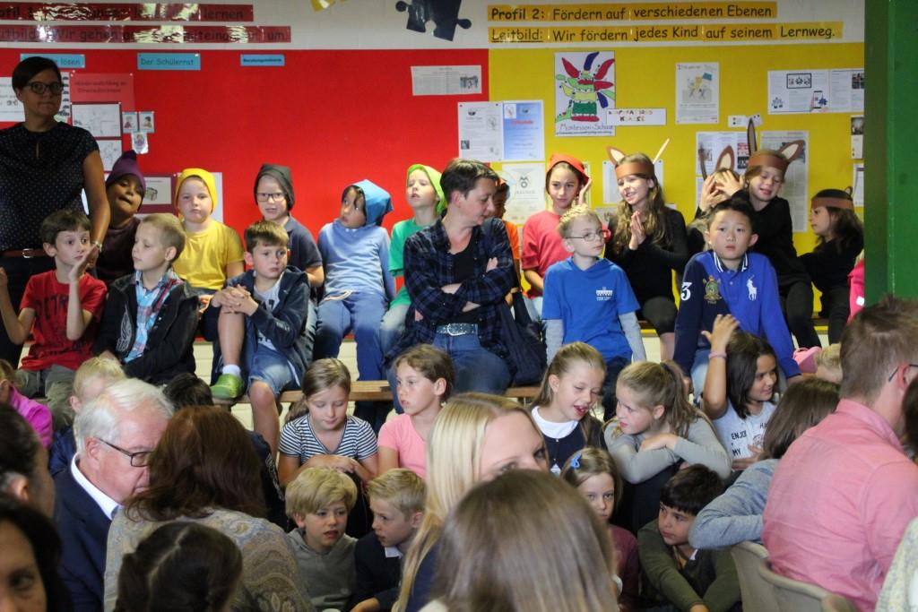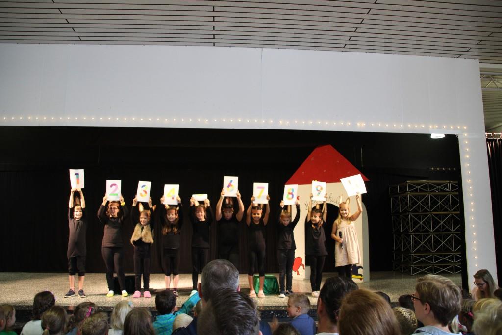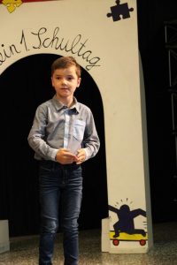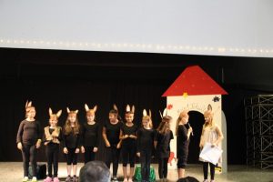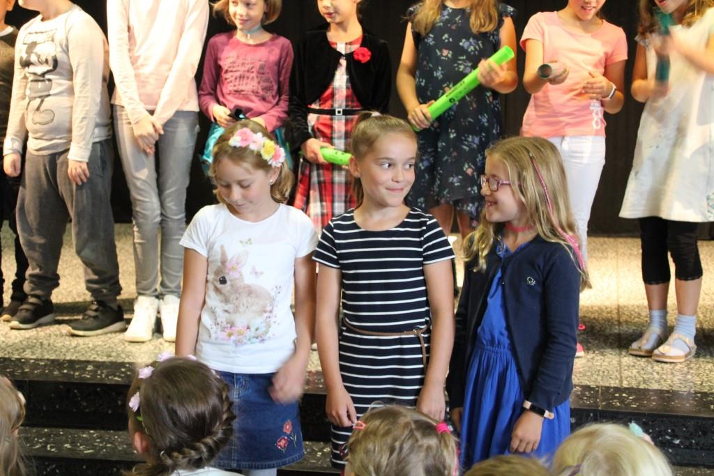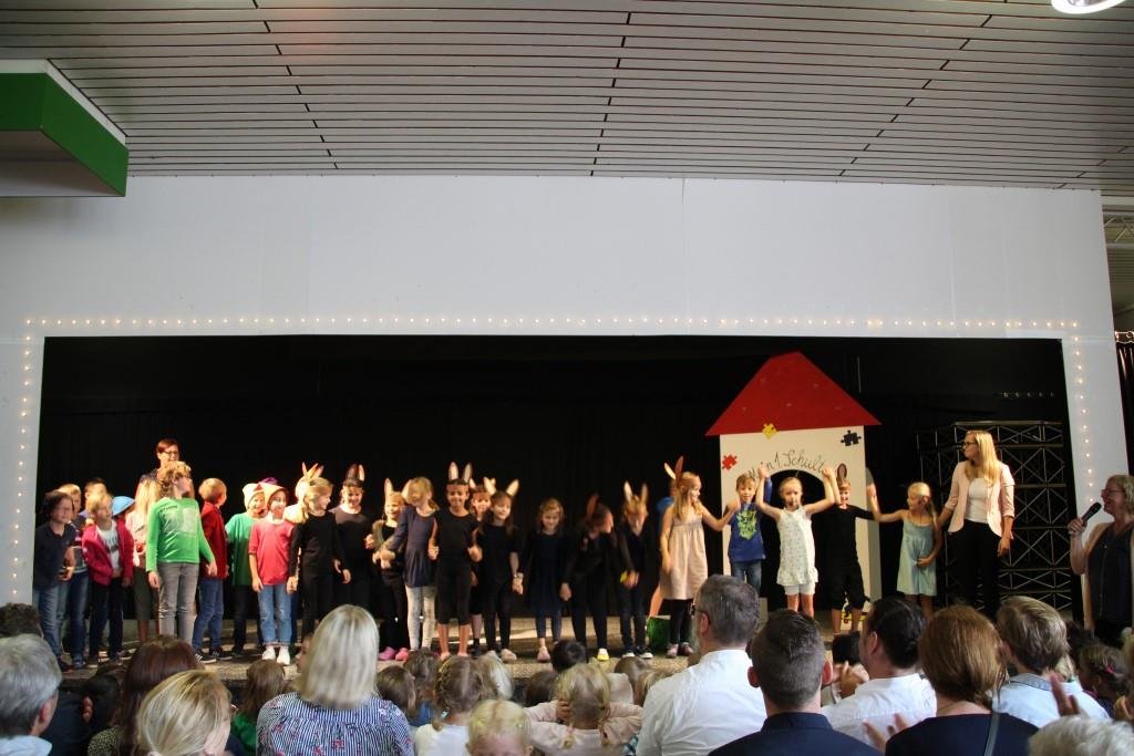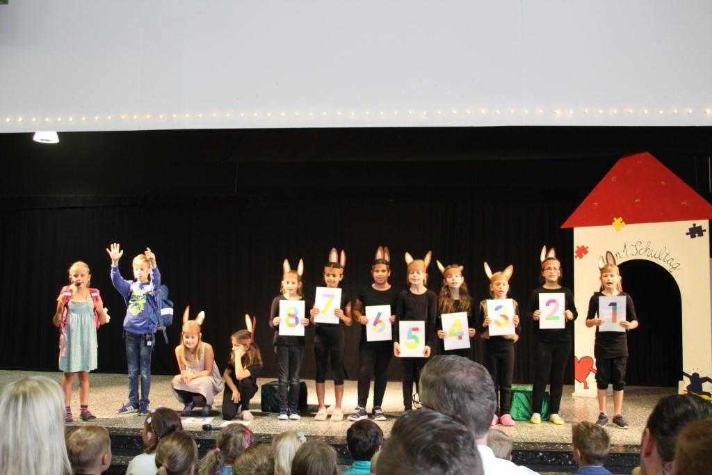 Es folgte eine sehr musikalische Einschulungsfeier. Es begann mit unserem Schullied „Schule ist mehr“ und nach einer kurzen Begrüßung folgte ein Stück der 3a und 3b, „die verschwundenen Zahlen“. Hasen und Zwerge hatten den Schulkindern die Zahlen und Buchstaben gestohlen, aber am Ende ging alles gut aus!