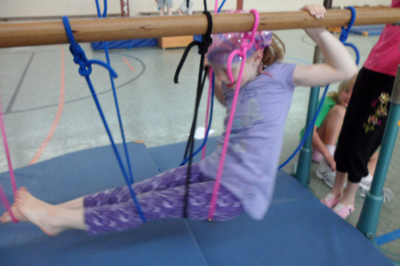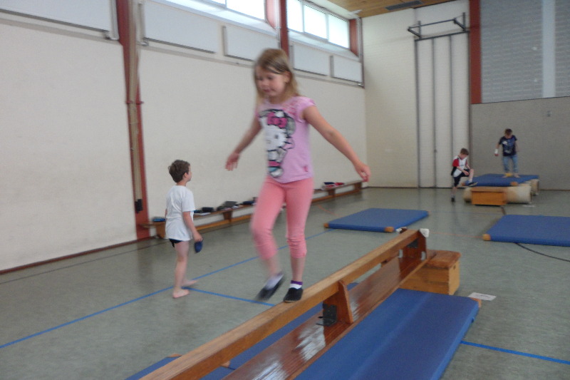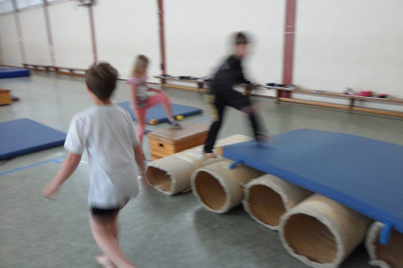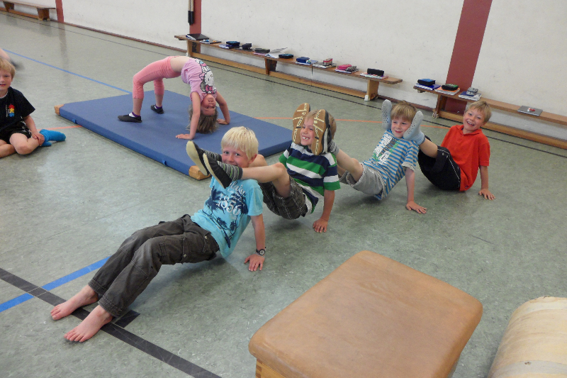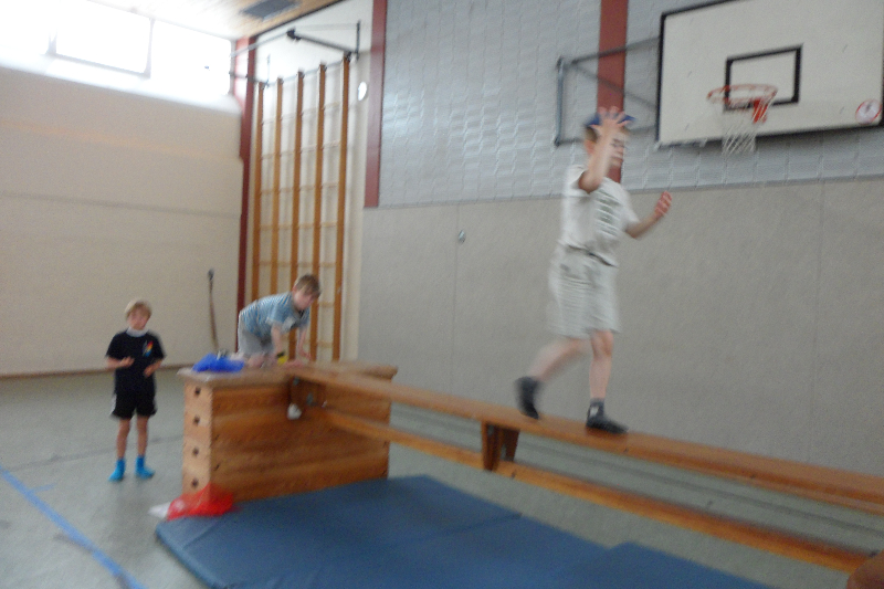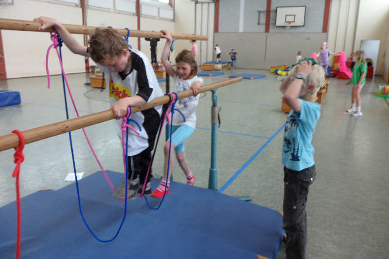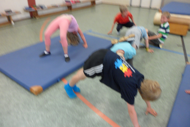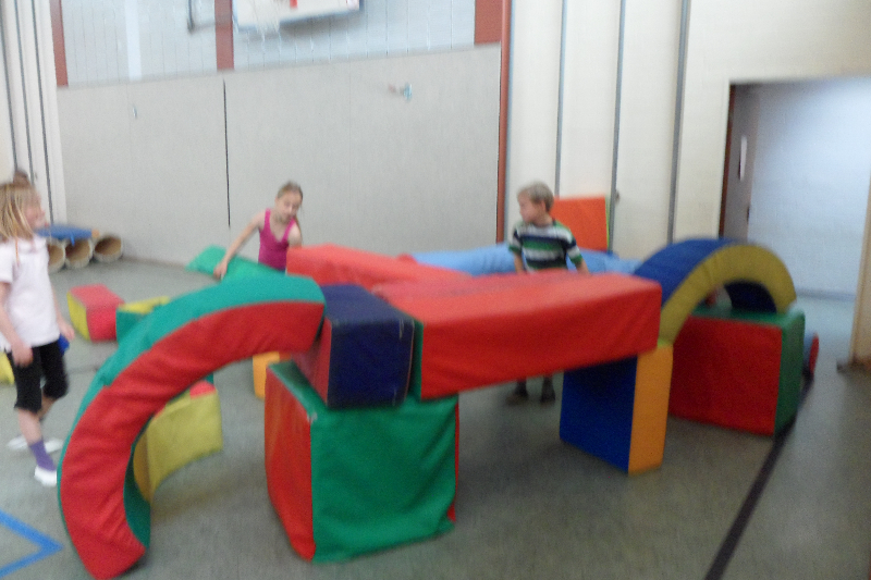 Der Entdeckertag zum Thema „Brücken“ startete in der Klasse 2a in der Turnhalle. Es gab ein Brückenlaufspiel, dann wurden Brücken mit dem eigenen Körper und zusammen mit einem Partner gebaut. Danach wurde an einem Geräteparcours getestet, welche Brücken aus Turngeräten besonders stabil und welche eher ganz schön wackeling sind. Nicht fehlen durften die Riesenbauklötze, die wir uns zum Brückenbau aus dem Hort geliehen hatten.