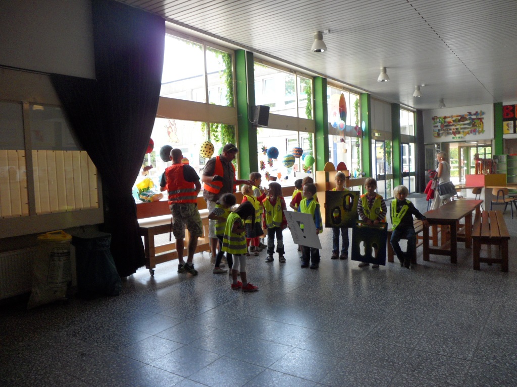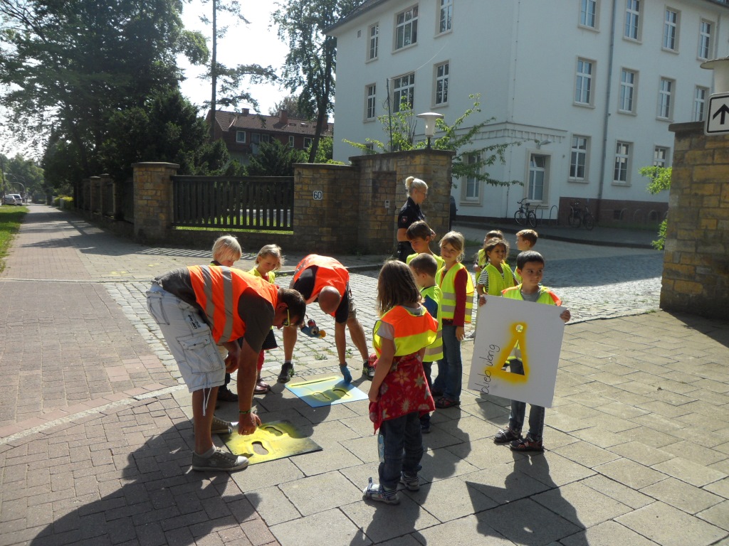 Die beiden ersten Klassen unserer Schule sprühten mit Unterstützung der Polizei und des Hausmeisters viele laufende gelbe Füße auf. Sie weisen den Schulanfängern den richtigen Fußweg zur Schule. Zudem wurden an Kreuzungen stehende Füße mit Haltelinien und Ausrufezeichen aufgebracht, um so die kleinen und großen Fußgänger auf mögliche Gefahrensituationen hinzuweisen.