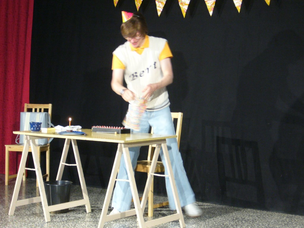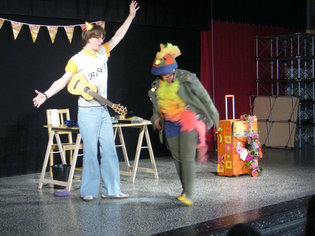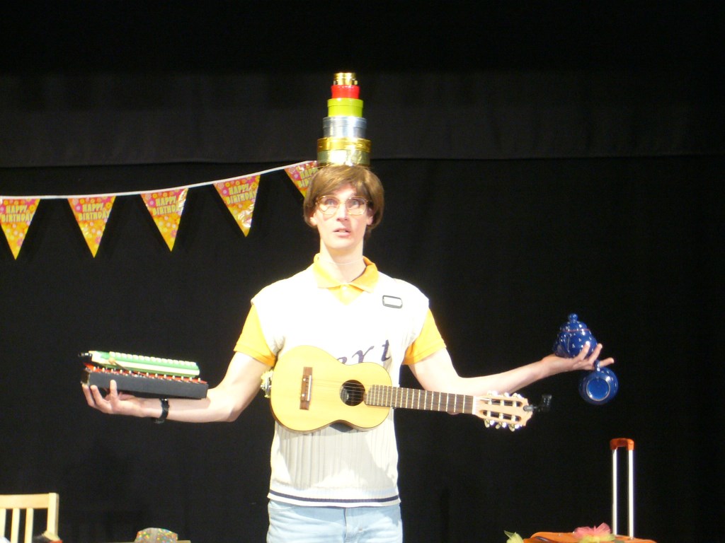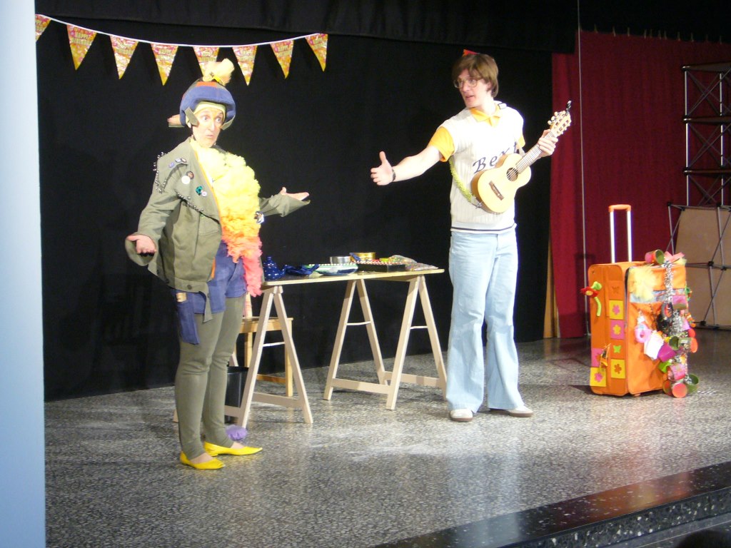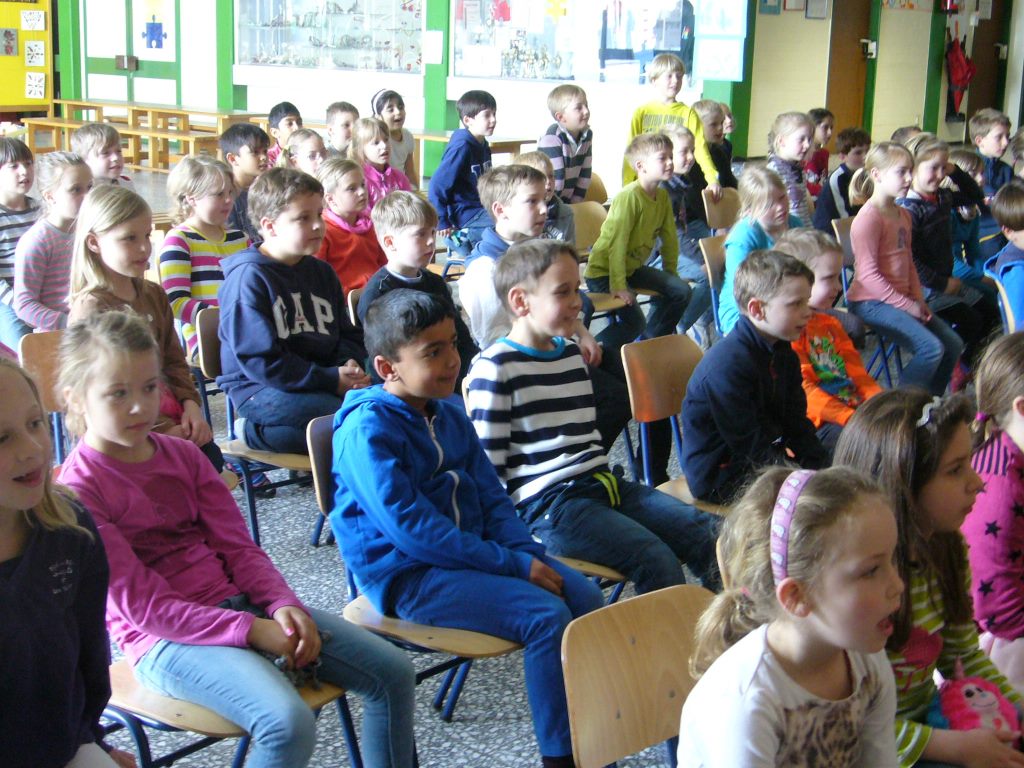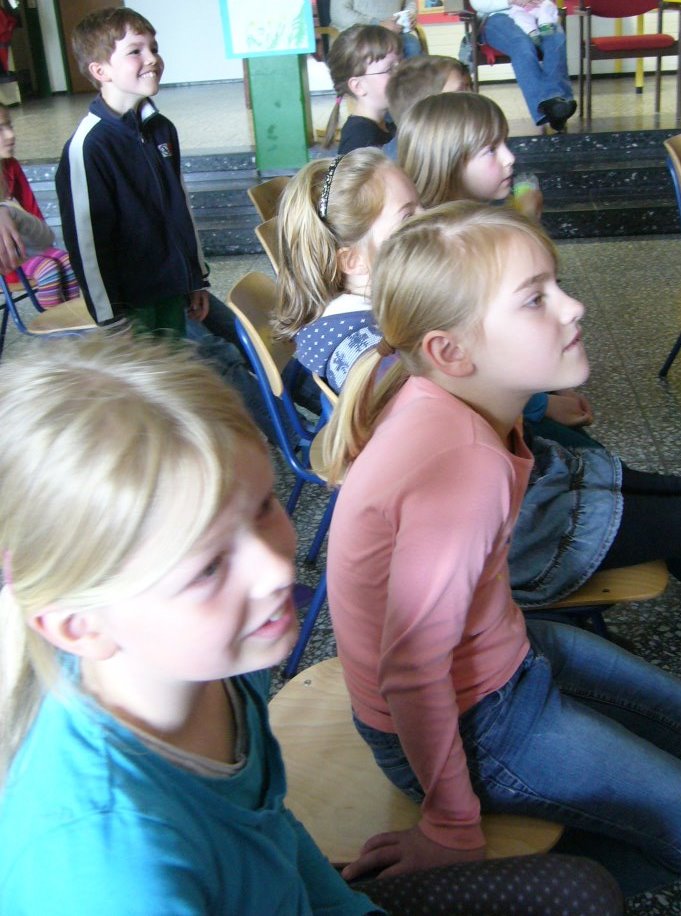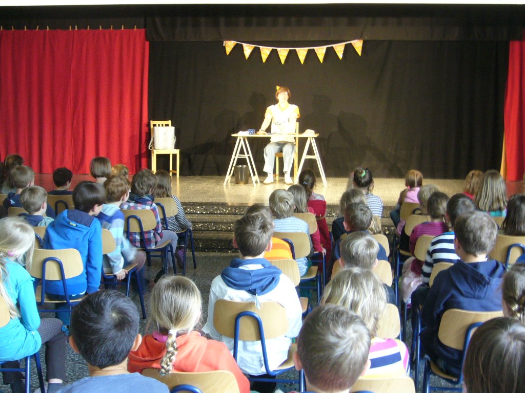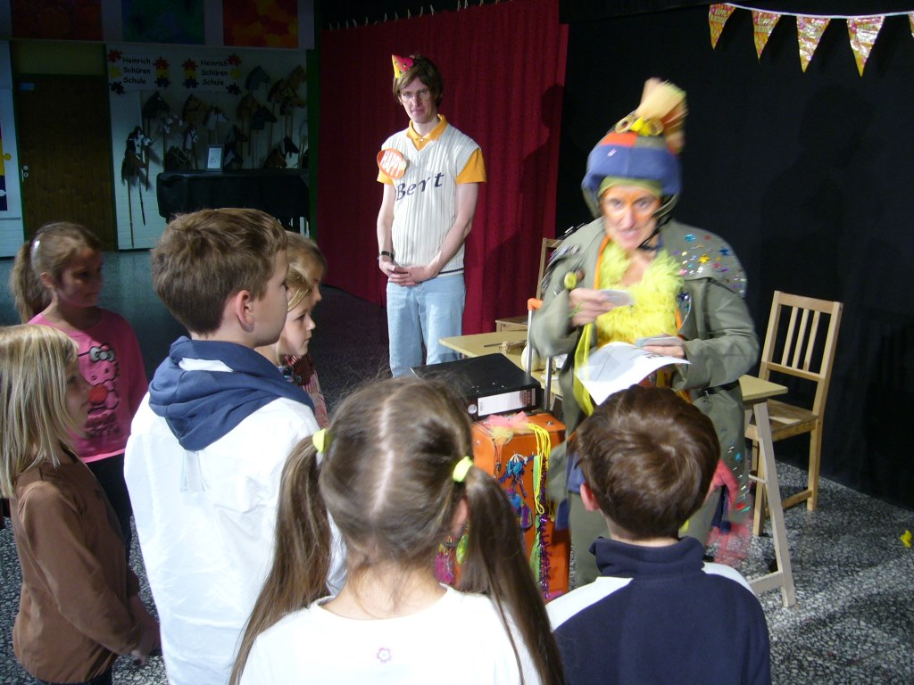 Es ist ganz schön traurig, seinen Geburtstag allein feiern zu müssen, nur Mama hat eine Karte geschrieben. Zum Glück taucht aber Bird auf, so dass es dann doch noch mit der Feier klappt, es gesellt sich sogar noch EGGBIRD/Egbert dazu, ein frischgeborenes Ei. Also bitte! Das Zwei-Personenstück in englischer Sprache unterhielt die Heinrich-Schüren-Kinder aufs Beste. Da wurde Musik gemacht, mit Konfetti und Mehl geworfen und Cake vernascht, auch das Tischfeuerwerk soll nicht vergessen werden. Nun , und so ganz nebenbei lernten die Kinder, ohne es zu merken schon eine Menge Vokabeln in englischer Sprache. Ein liebevolles Stück, aufgeführt von zwei engagierten Künstlern, die es allen Kindern aus allen Klassenstufen leicht machten, die Geschichte zu verstehen. Am Ende durften noch Fragen gestellt werden und jede Klasse bekam eine CD mit allen Liedern, sowie eine Vokabelliste des Stückes geschenkt. Herzlichen Dank an das Ensemble!