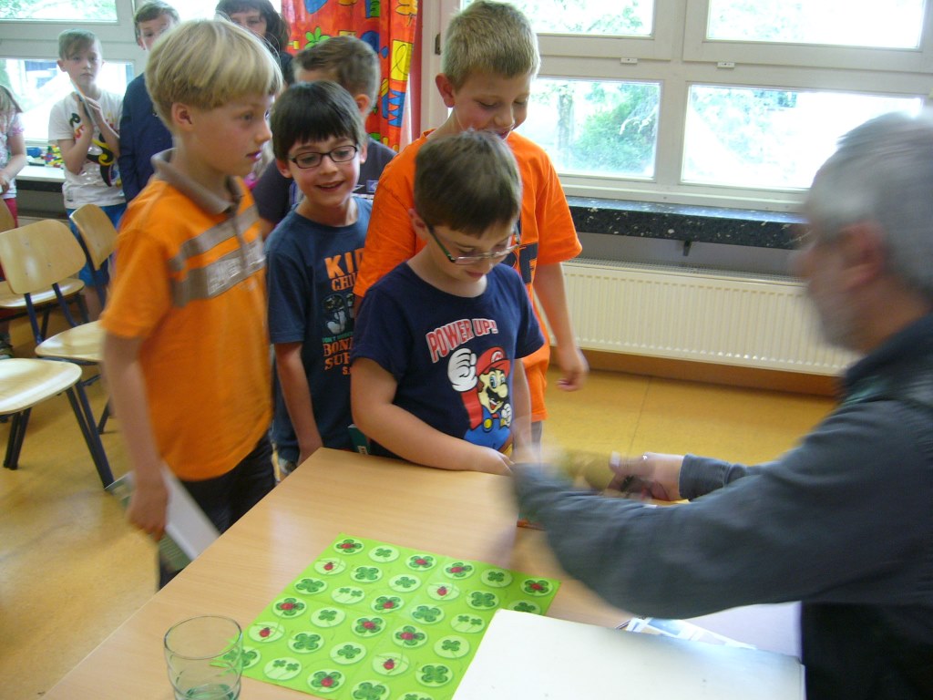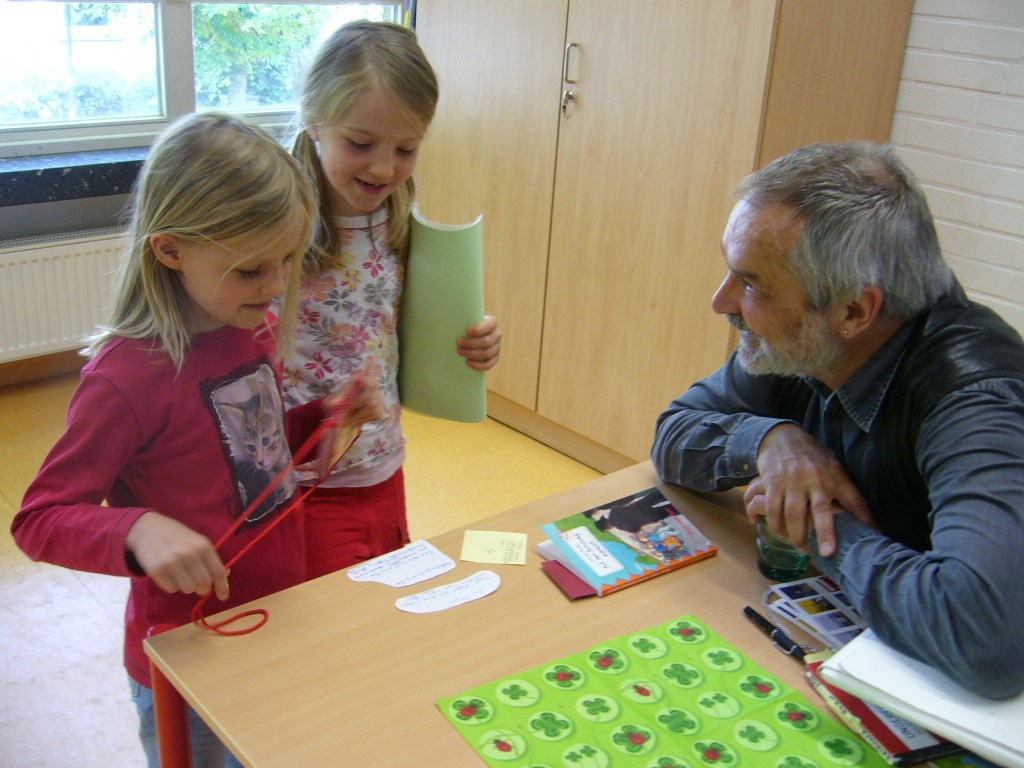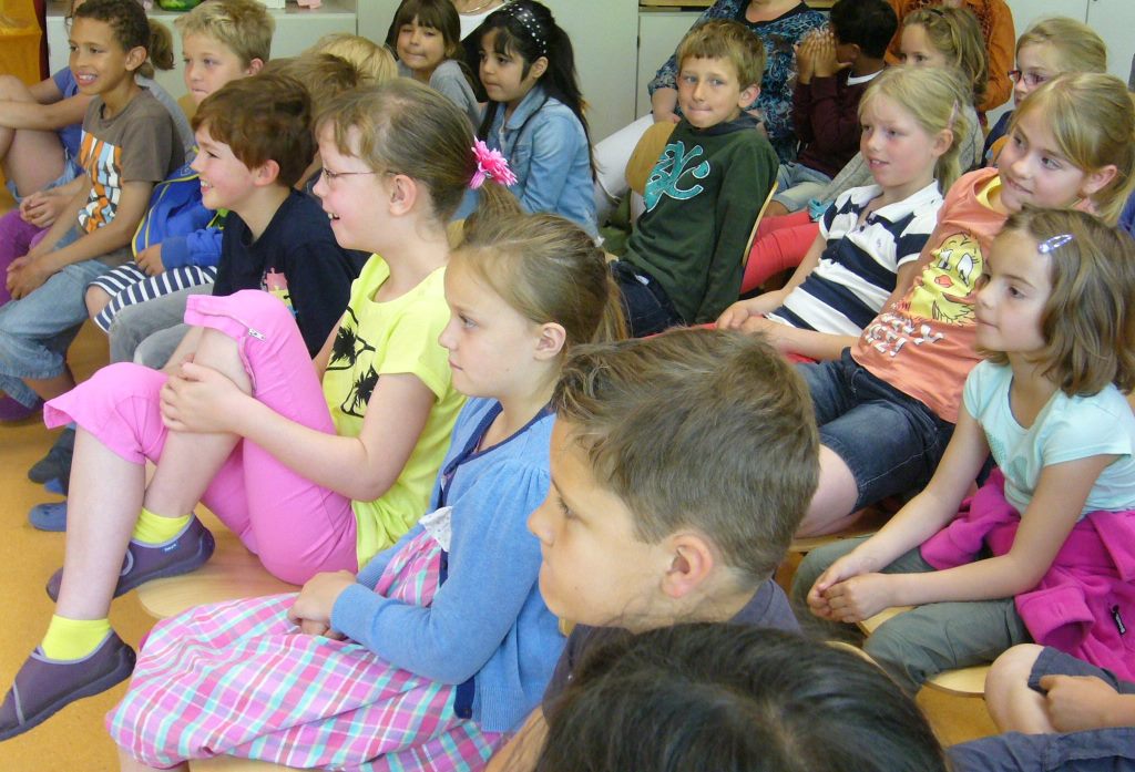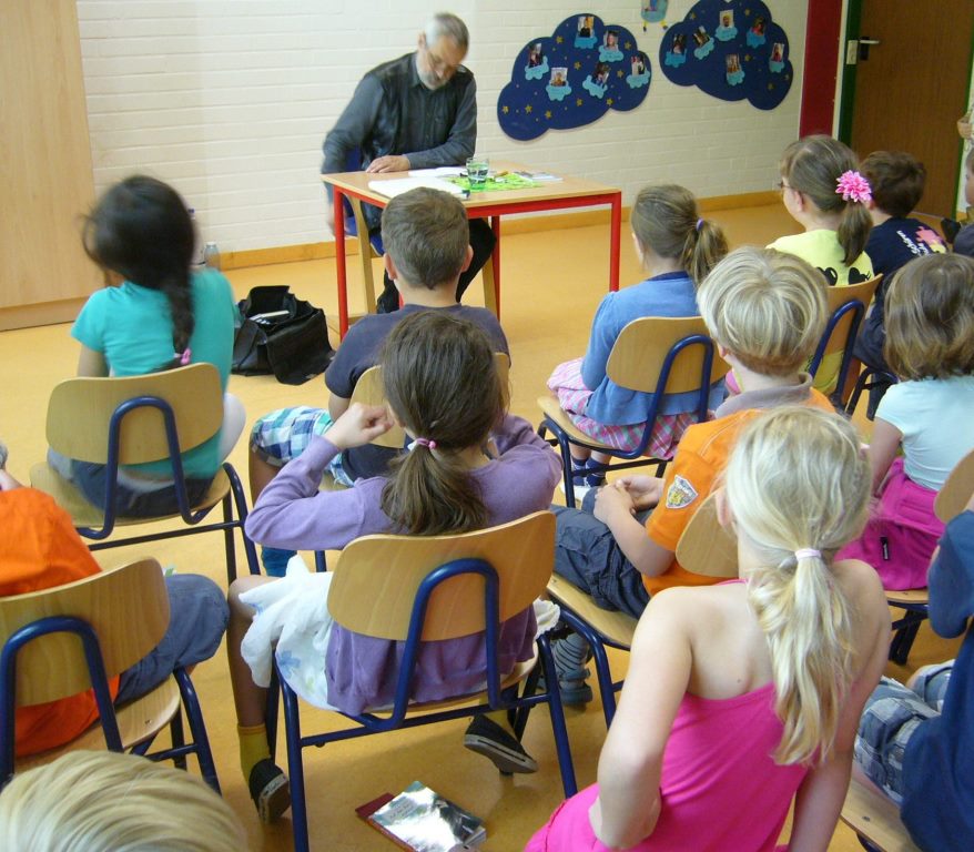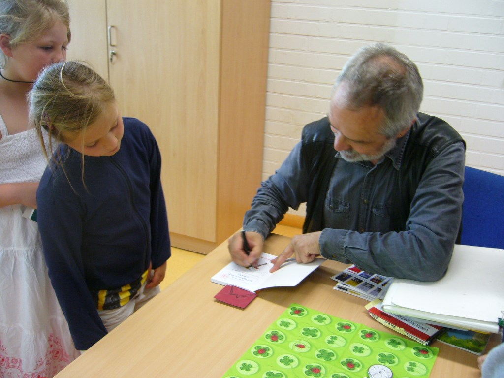 Werner Färbers Antwort auf die Frage, woher er die Ideen für seine Bücher nimmt. Er schnappt viel in den Schulen auf oder erinnert sich an eigene Erlebnisse als Kind. Er ist zum Beispiel auf dem Heimweg, vom Einkaufen von großen Jungen angehalten worden, die ihm seine gerade erstandenen Streichhölzer wegnehmen wollten. So entstand die Idee zum Buch „Auf dem Schulweg erpresst.“ Nach einer spannenden Lesung aus einem seiner Bücher stellt sich Werner Färber zahllosen Fragen der Kinder, die sich prima auf den Besuch vorbereitet hatten. Zum Schluss trug er einige Tiergedichte vor, aus seinem Werk „Ungereimtheiten“. Er empfahl das Anbringen einer Pinnwand für eigene Gedichte der Kinder in jeder Klasse. Sein Erstaunen war groß, als er erfuhr, dass das in der 2a schon längst eingerichtet ist. Sophie und Johanna ergriffen die Gelegenheit und trugen ihm ihre eigenen Werke vor. In insgesamt drei Lesungen, jeweils für Klasse 2, 3 und 4 stellte er verschiedene Bücher vor und gab auch noch fleißig Autogramme. Viele SchülerInnen nutzten die Gelegenheit am Büchertisch der Dombuchhandlung weitere Bücher unseres Gastes zu erwerben.