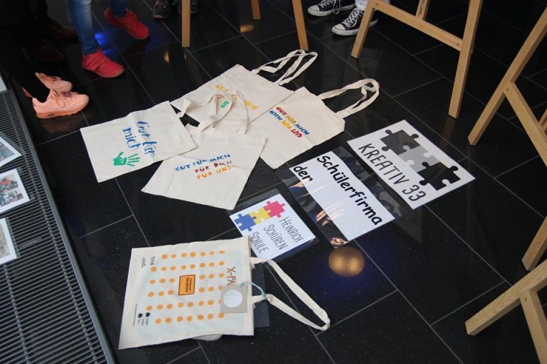 Die Schülerfirma KREATIV 33 der Heinrich-Schüren-Schule stellte hier die selbst bedruckten Stofftaschen aus. Das „Plastiktütenmonster“ der Kooperationsklasse war ebenfalls mit auf Reise.