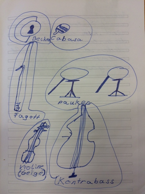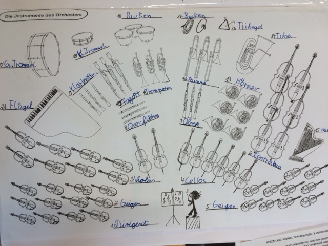 Die gruppenweise Anordnung eines Orchesters konnten wir „erleben“. Alle Kinder der Klasse wissen nun auch, warum in einem Orchester die Schlaginstrumente immer hinten angeordnet sind und die Streichinstrumente vorne.