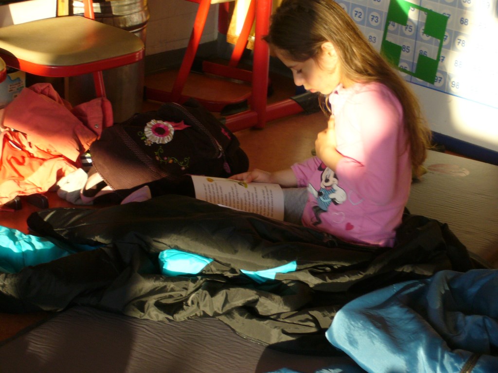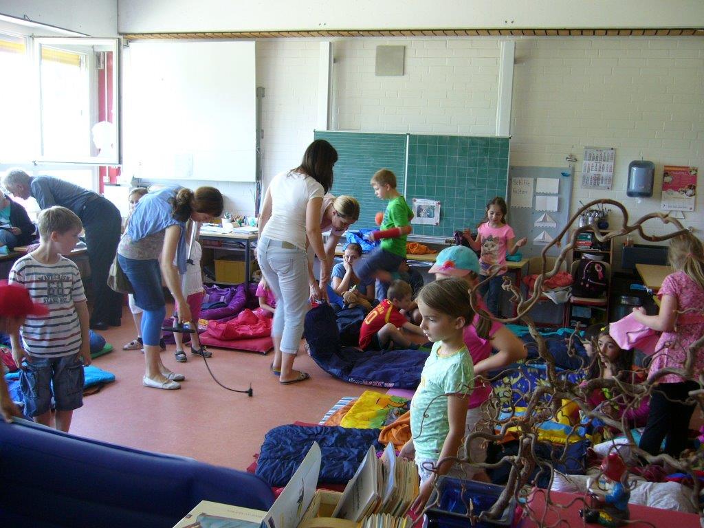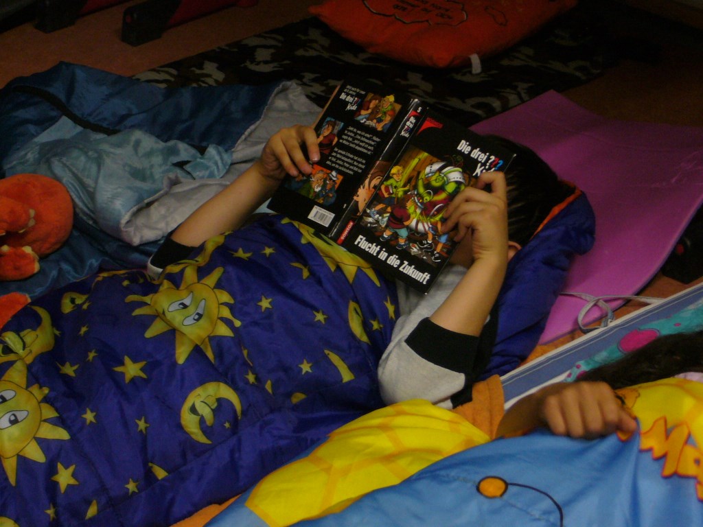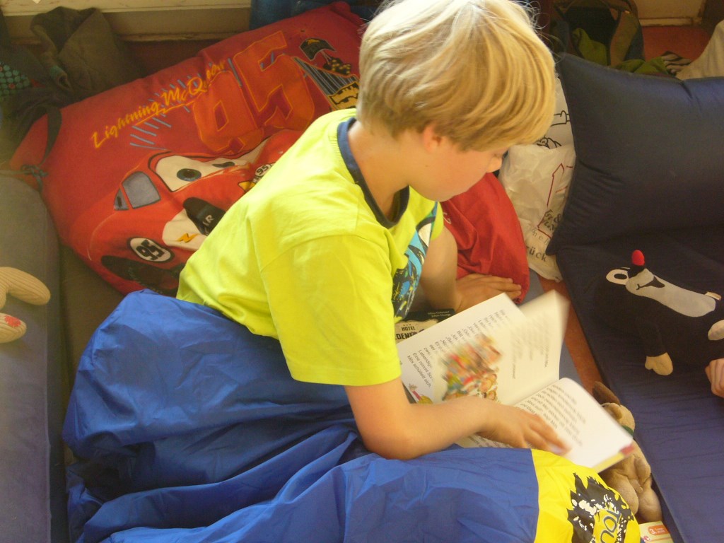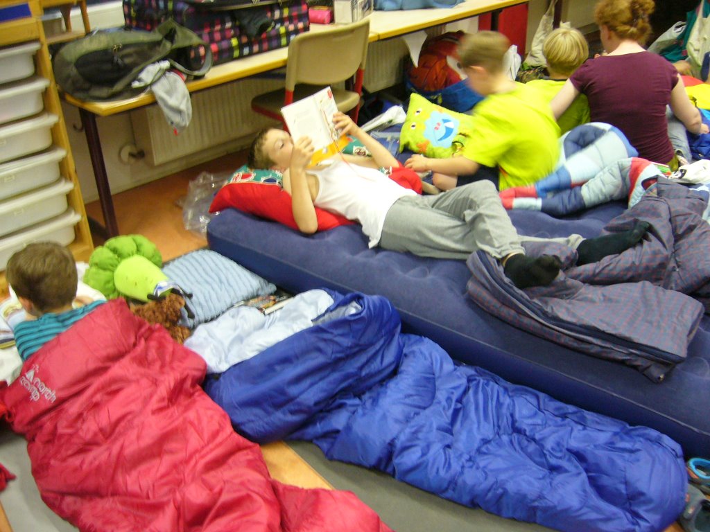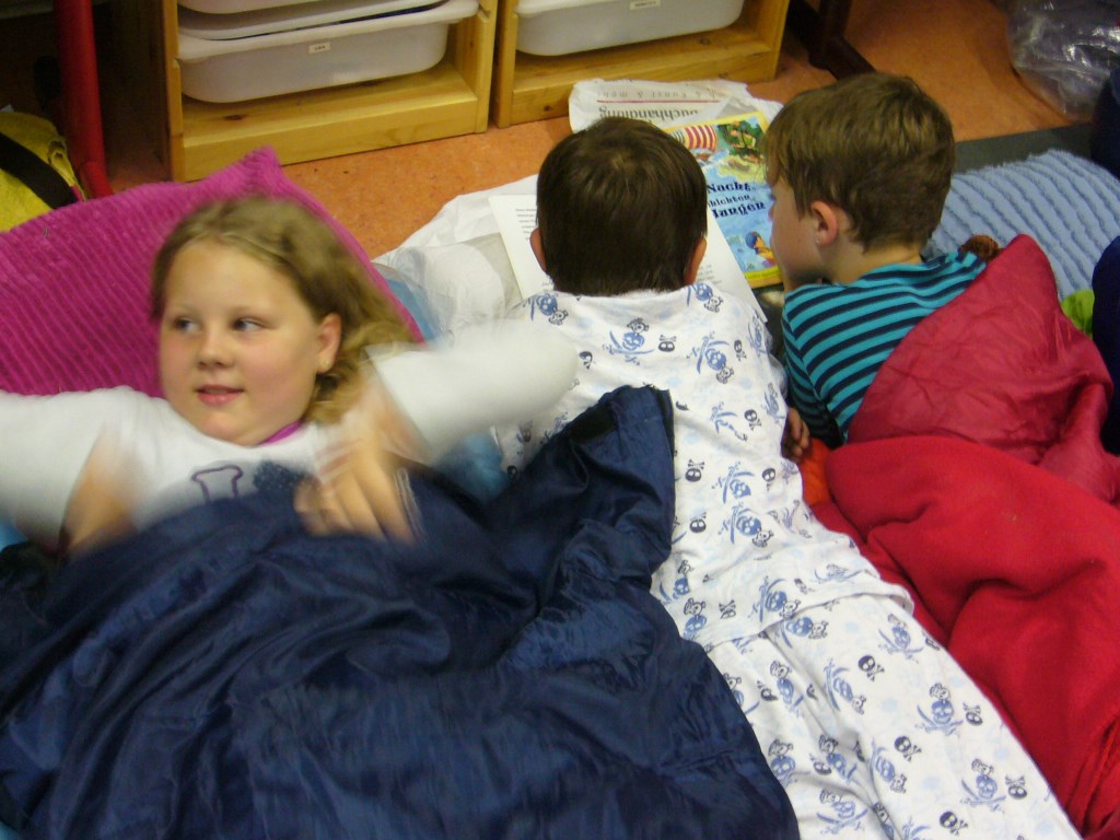 In der Schule angekommen halfen alle schnell mit den Tisch zu decken und das große Abendbuffet aufzubauen. Danach hatten wir Zeit zum Spielen und Lesen. Nach einer Gutenachtgeschichte dauerte es noch ziemlich lange, bis die letzten Kinder sich entschlossen hatten, Augen und Mund zu schließen. Nach einer kurzen, aber spannenden Nacht, waren die ersten Kinder schon um kurz nach 6 Uhr wach. Sie schnappten sich ihr Buch und ließen die übrigen Kinder noch eine Stunde schlafen.