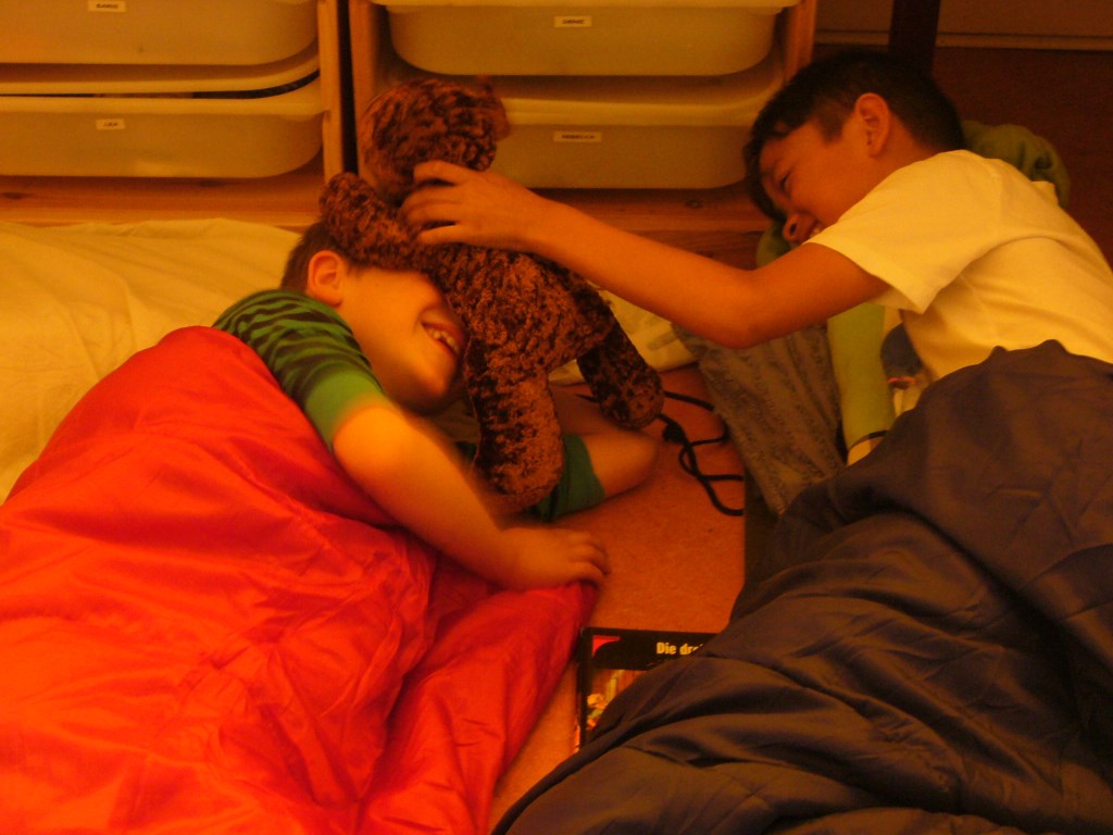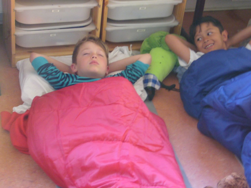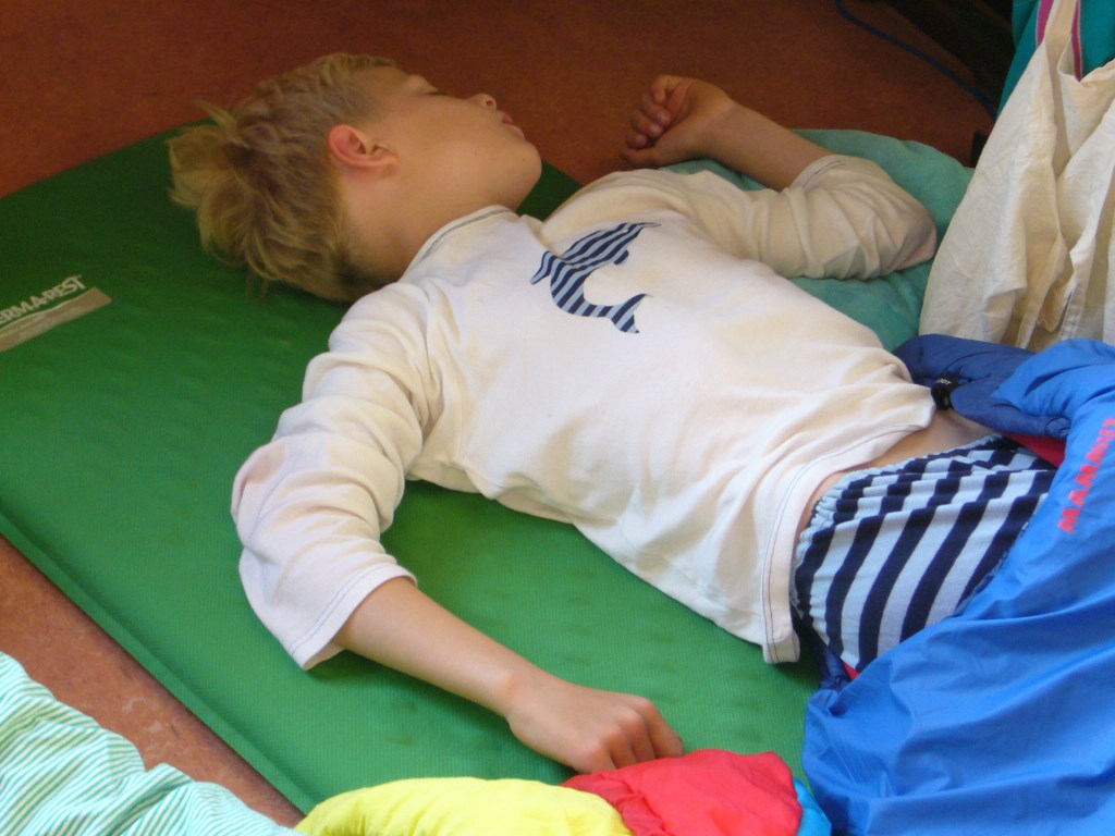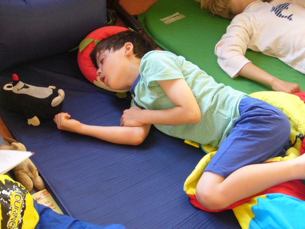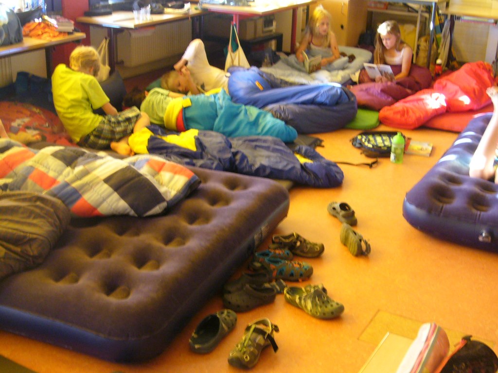 In der Schule angekommen halfen alle schnell mit den Tisch zu decken und das große Abendbuffet aufzubauen. Danach hatten wir Zeit zum Spielen und Lesen. Nach einer Gutenachtgeschichte dauerte es noch ziemlich lange, bis die letzten Kinder sich entschlossen hatten, Augen und Mund zu schließen. Nach einer kurzen, aber spannenden Nacht, waren die ersten Kinder schon um kurz nach 6 Uhr wach. Sie schnappten sich ihr Buch und ließen die übrigen Kinder noch eine Stunde schlafen.