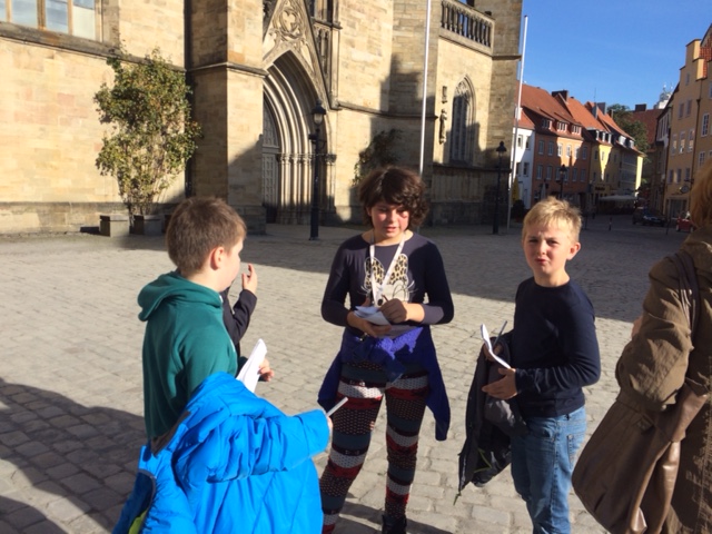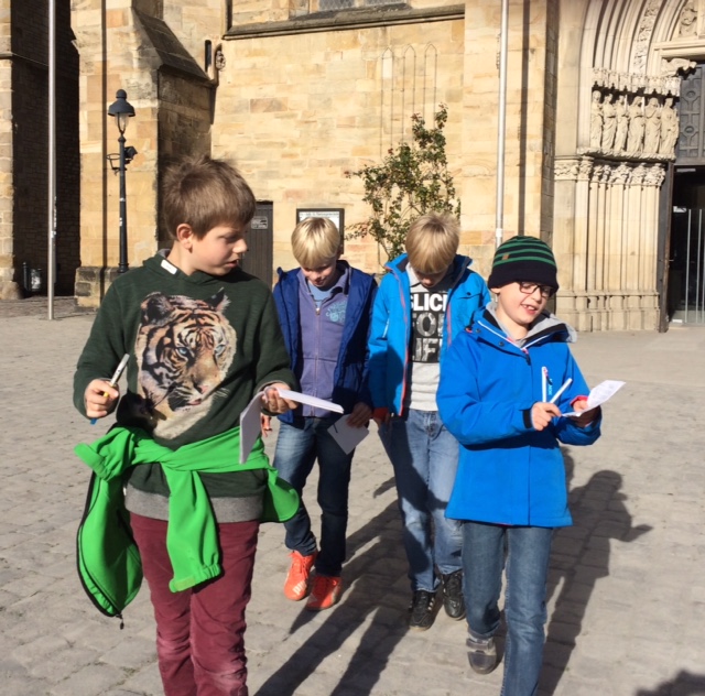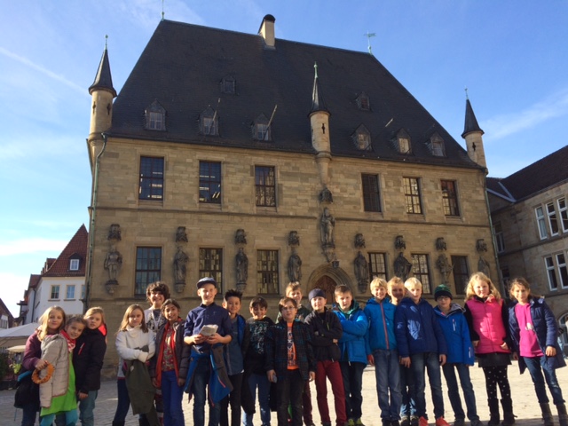 Aufgeteilt in Kleingruppen haben die Kinder sich auf Entdeckungstour begeben und Fragen bearbeitet –> rund um Rathaus, Stadtwaage, Marienkirche, Rathausplatz, das Erich Maria Remarque-Friedenszentrum und den Bürgerbrunnen auf dem Platz des Westfählischen Friedens.