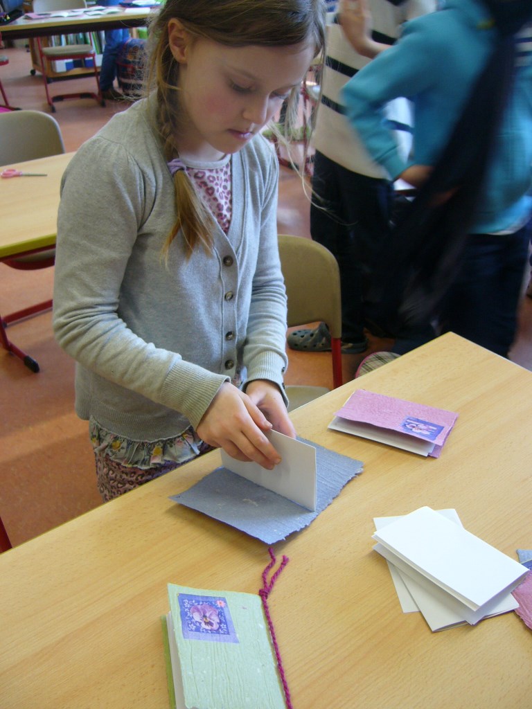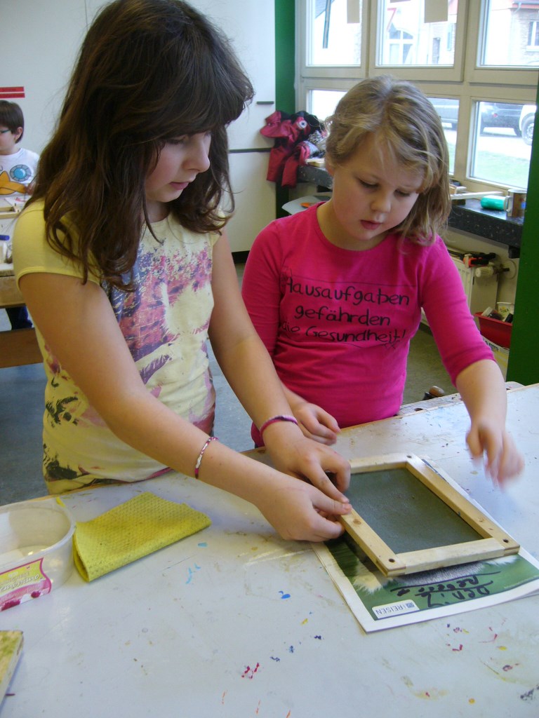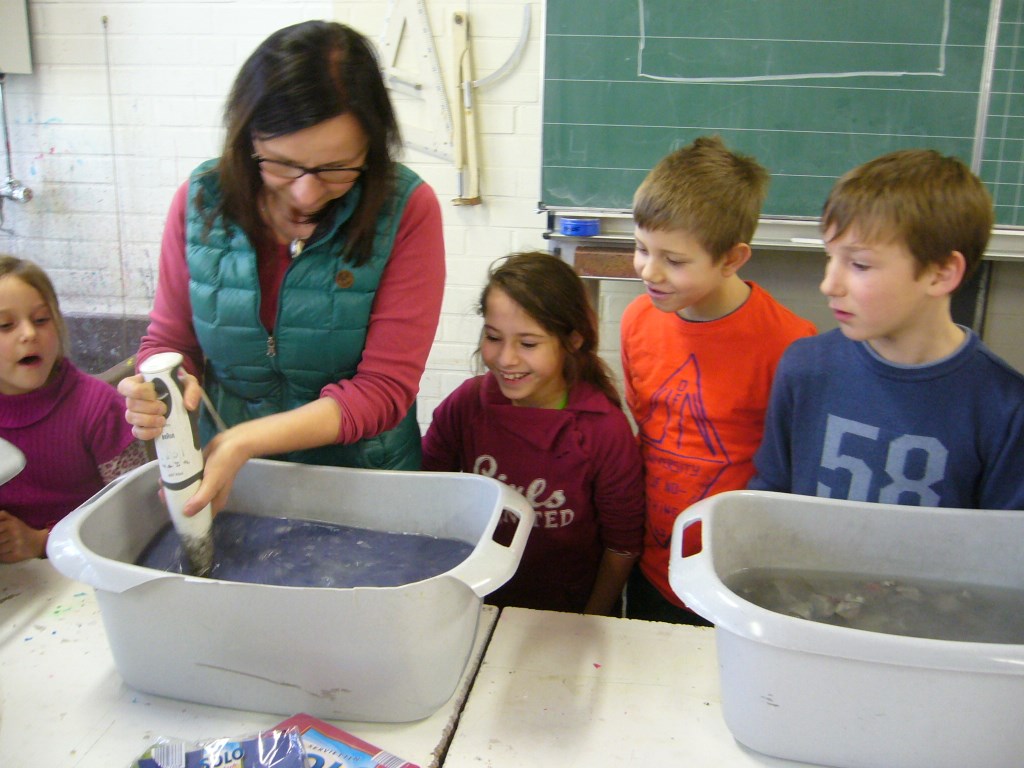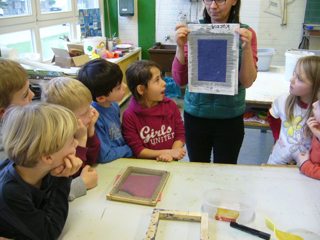 Die Klassen 2a und 2b haben sich im Fach Sachunterricht mit dem Recycling von Papier beschäftigt. Um auch praktische Erfahrungen sammeln zu können, hat Frau Kuczia (vom Verein für Ökologie und Umweltbildung Osnabrück e.V.) die Kinder am 7. und 8. Februar 2014 in der Schule besucht. Die Schüler waren hochmotiviert und zeigten viel Freude beim Schöpfen. Jedes Kind hatte zum Schluss drei farblich unterschiedliche Papiere geschöpft, die es mit kleinen Serviettenbildern verschönern konnte. An den folgenden Tagen haben die Kinder ihre Papiere selbst gebügelt, gefaltet, Kordeln gedreht und weiße Papiere hineingelegt. Aus den geschöpften Papieren entstanden so kleine Bücher, die stolz nach Hause getragen wurden.