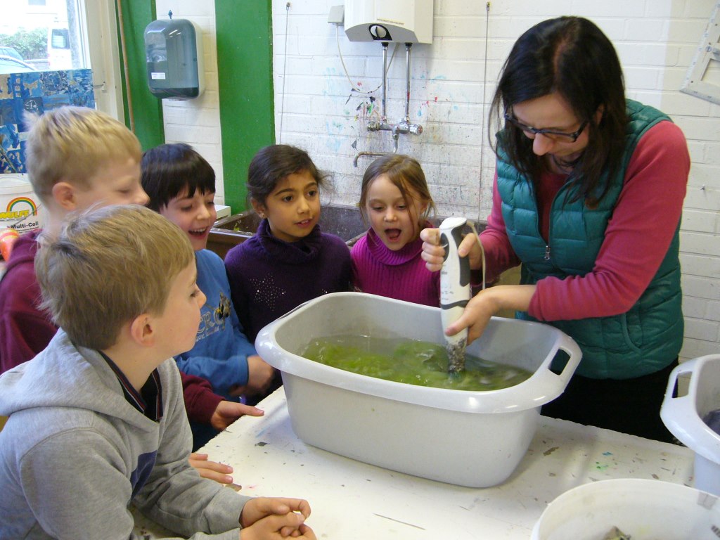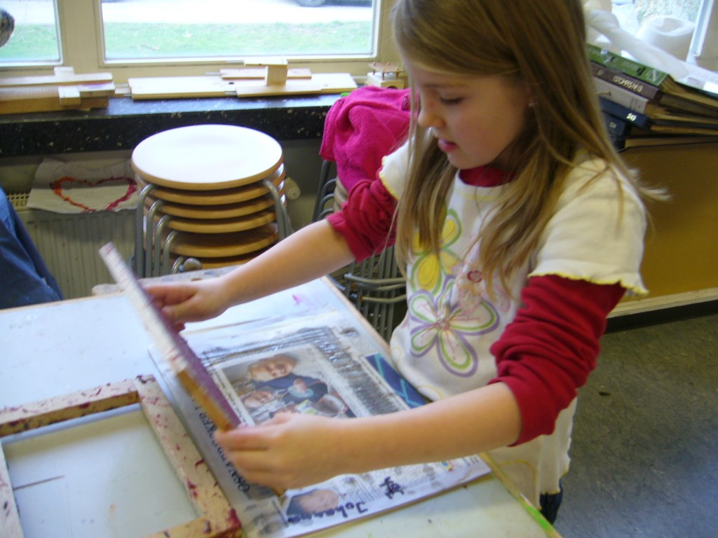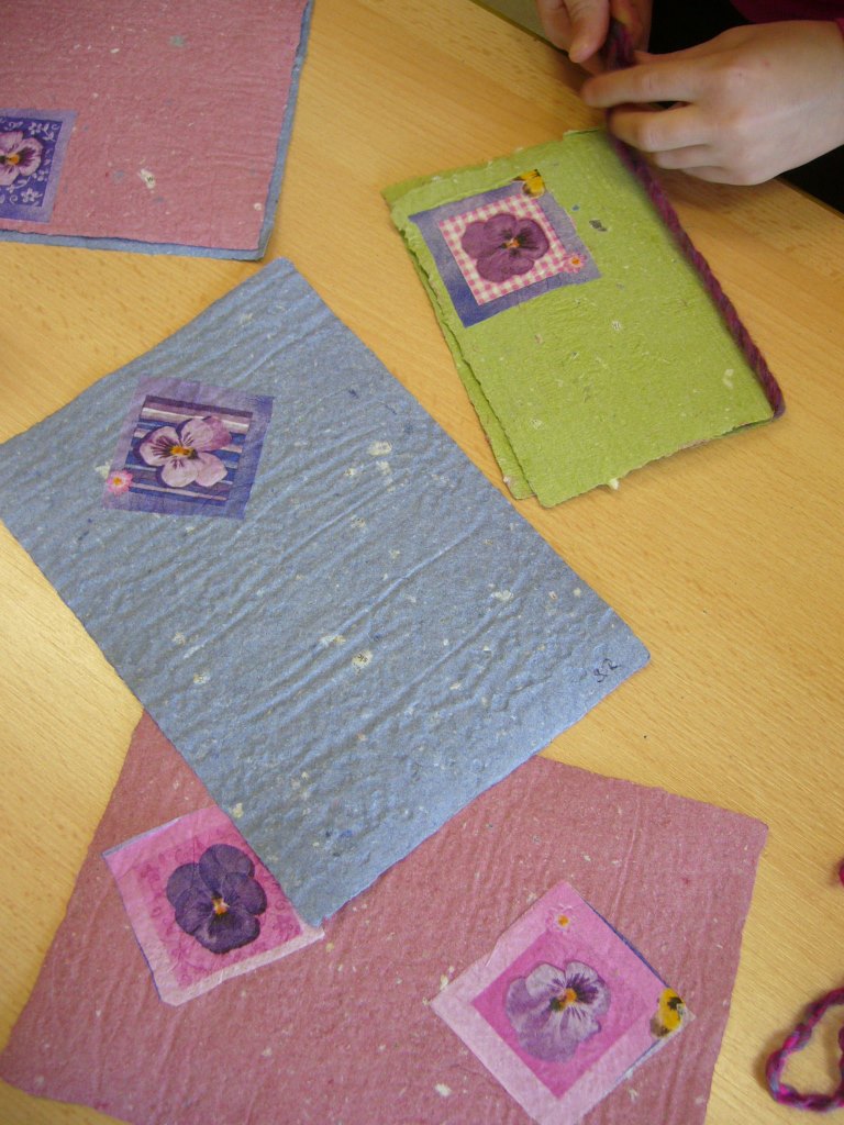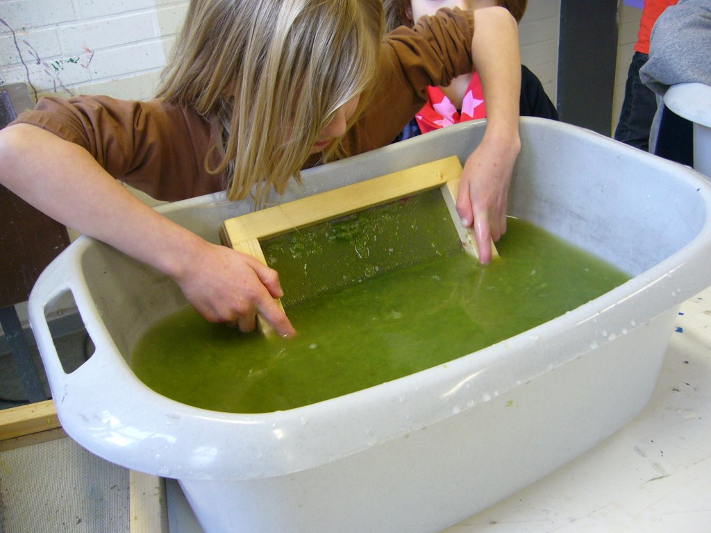 Die Klassen 2a und 2b haben sich im Fach Sachunterricht mit dem Recycling von Papier beschäftigt. Um auch praktische Erfahrungen sammeln zu können, hat Frau Kuczia (vom Verein für Ökologie und Umweltbildung Osnabrück e.V.) die Kinder am 7. und 8. Februar 2014 in der Schule besucht. Die Schüler waren hochmotiviert und zeigten viel Freude beim Schöpfen. Jedes Kind hatte zum Schluss drei farblich unterschiedliche Papiere geschöpft, die es mit kleinen Serviettenbildern verschönern konnte. An den folgenden Tagen haben die Kinder ihre Papiere selbst gebügelt, gefaltet, Kordeln gedreht und weiße Papiere hineingelegt. Aus den geschöpften Papieren entstanden so kleine Bücher, die stolz nach Hause getragen wurden.