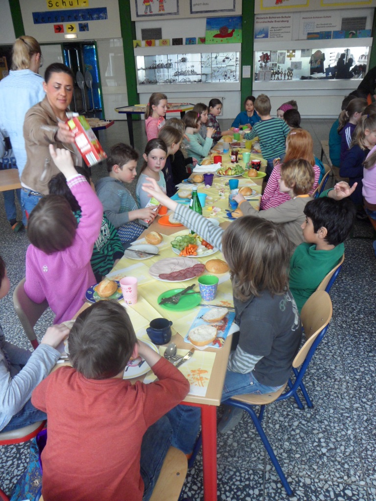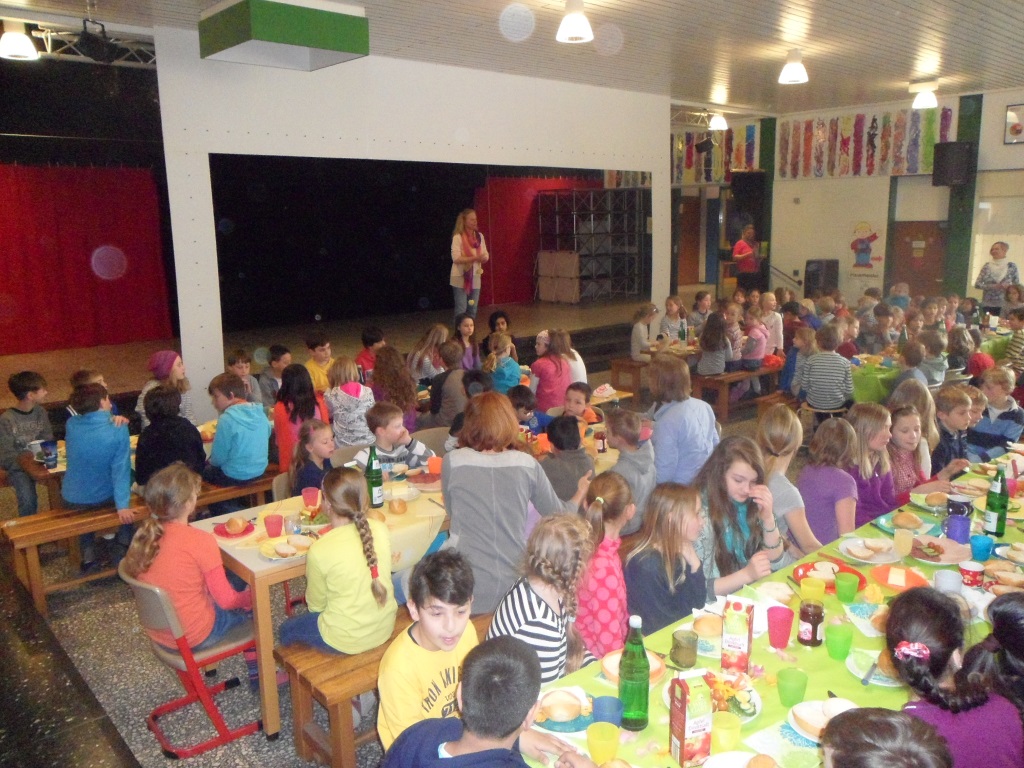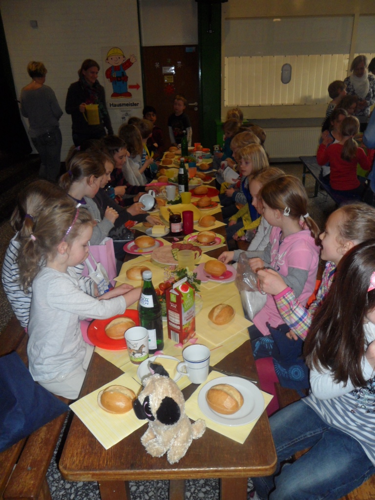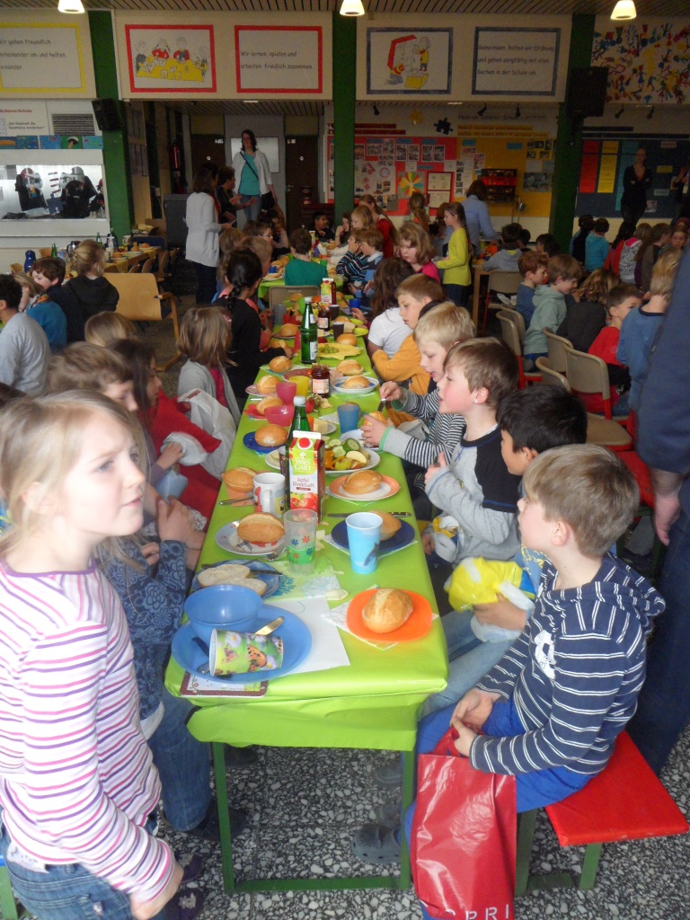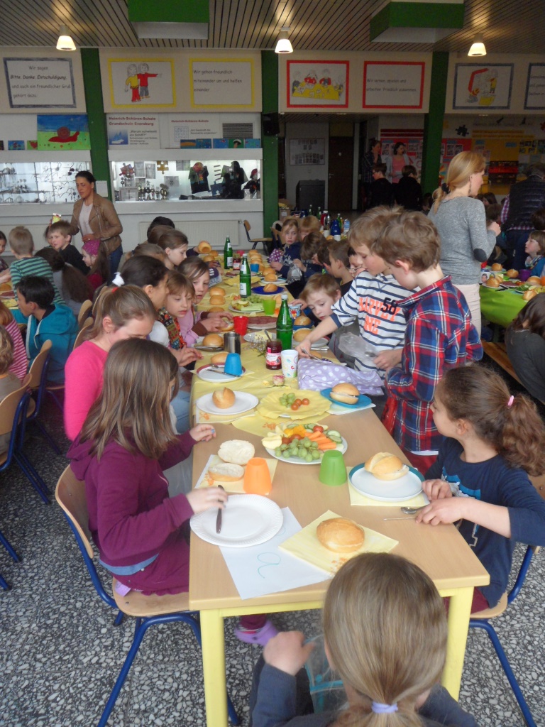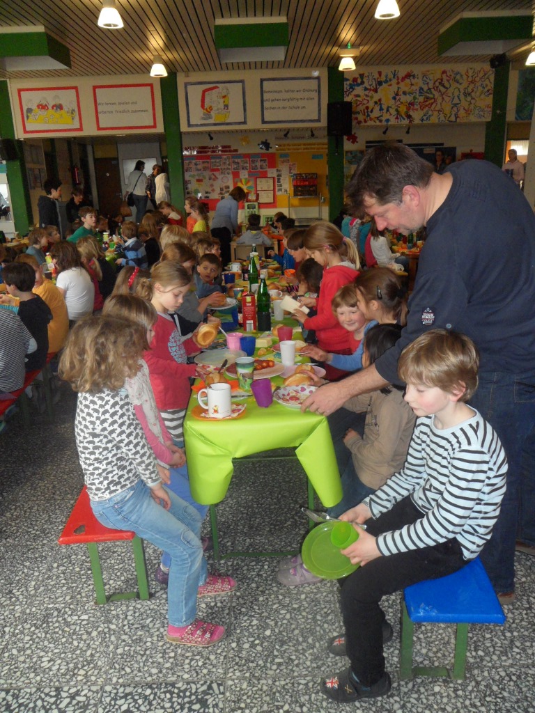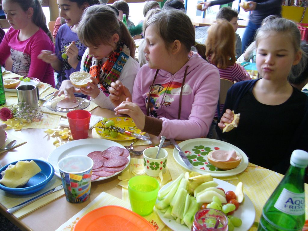 Kein Aprilscherz, am 1.4.14 fand unser diesjähriges Schulfrühstück statt. Leckere Düfte zogen durch die Schule, als sich alle Kinder und Lehrer an die liebevoll gedeckten Tische setzten. Da staunten alle sehr, als die geschnippelten Gemüse- und Obststückchen, die Käse- und Wurstteller zwischen den Rosenblättern gesichtet wurden. Dazu servierten uns viele Mütter und Väter unserer Schule Kakao und Wasser. Als Sondergast war Robert Schumann gekommen, der uns mit seiner Frühlingssinfonie in Ferienstimmung brachte. Ein großes Danke-schön an alle Helferinnen und Helfer. Mögen Sie alle frohe und gesegnete Ostern verleben!