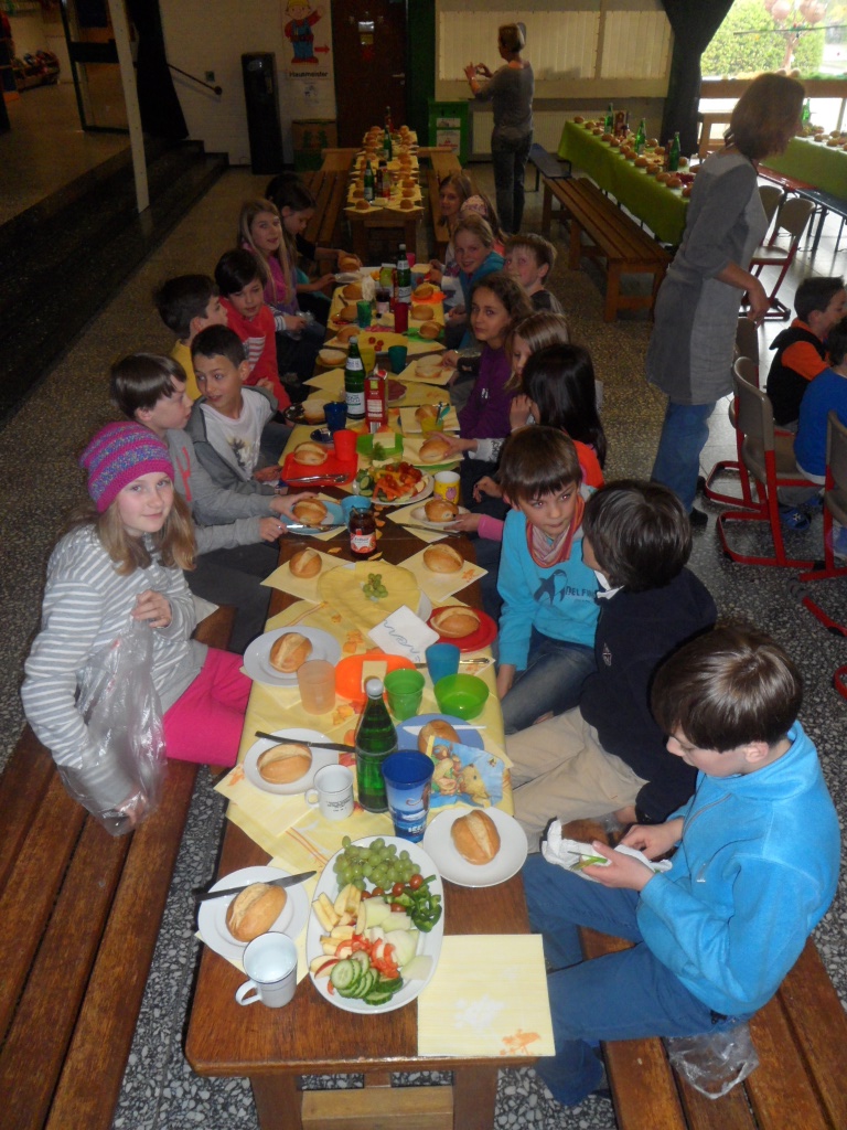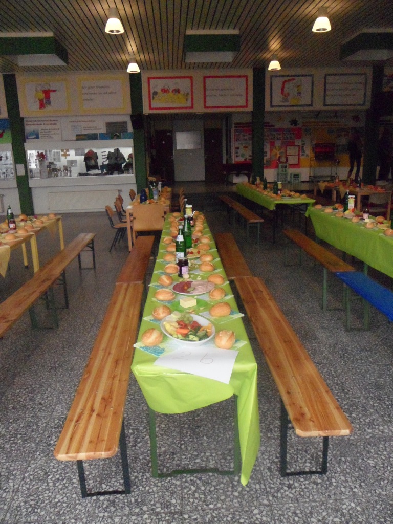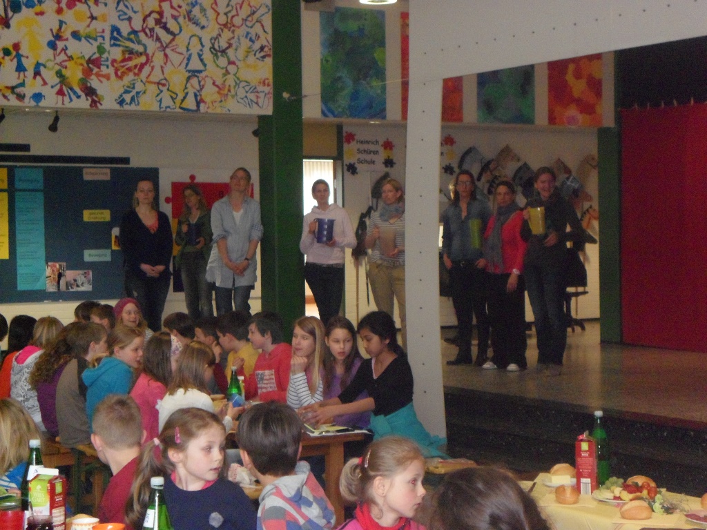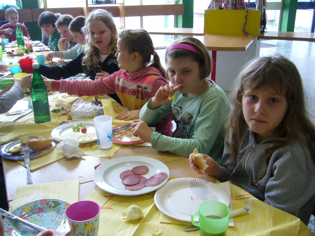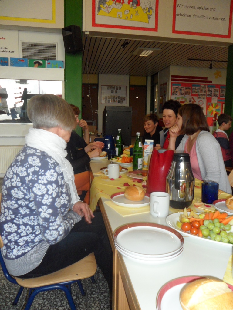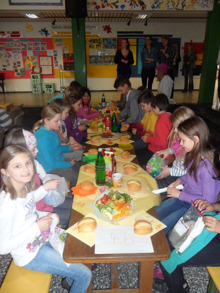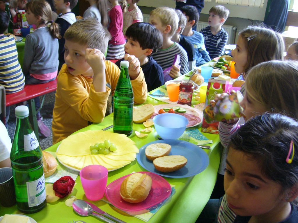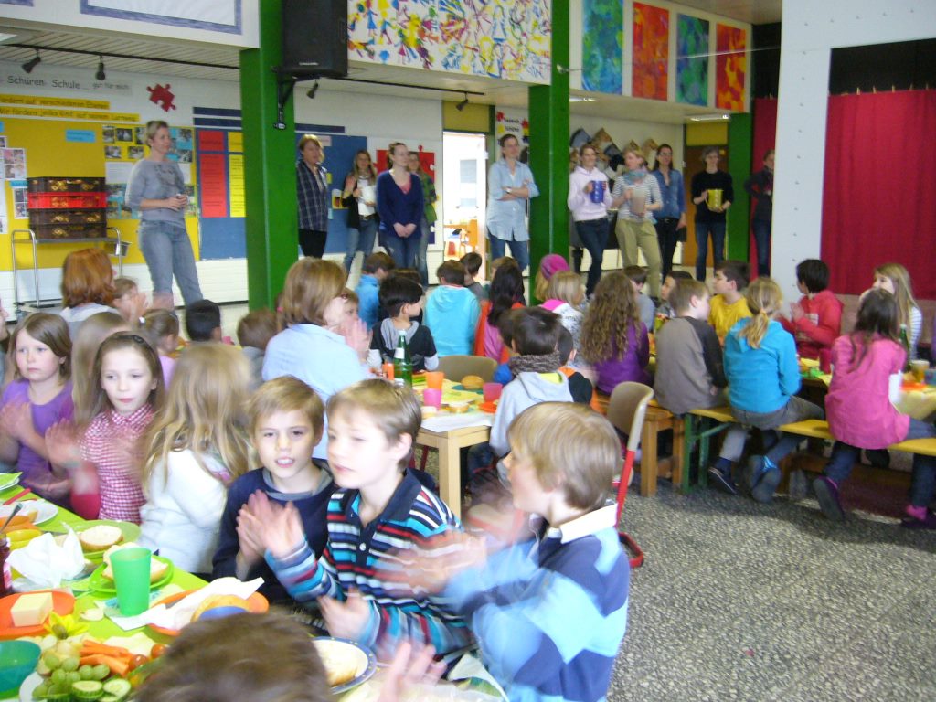 Kein Aprilscherz, am 1.4.14 fand unser diesjähriges Schulfrühstück statt. Leckere Düfte zogen durch die Schule, als sich alle Kinder und Lehrer an die liebevoll gedeckten Tische setzten. Da staunten alle sehr, als die geschnippelten Gemüse- und Obststückchen, die Käse- und Wurstteller zwischen den Rosenblättern gesichtet wurden. Dazu servierten uns viele Mütter und Väter unserer Schule Kakao und Wasser. Als Sondergast war Robert Schumann gekommen, der uns mit seiner Frühlingssinfonie in Ferienstimmung brachte. Ein großes Danke-schön an alle Helferinnen und Helfer. Mögen Sie alle frohe und gesegnete Ostern verleben!