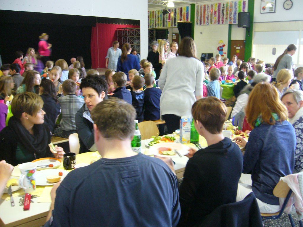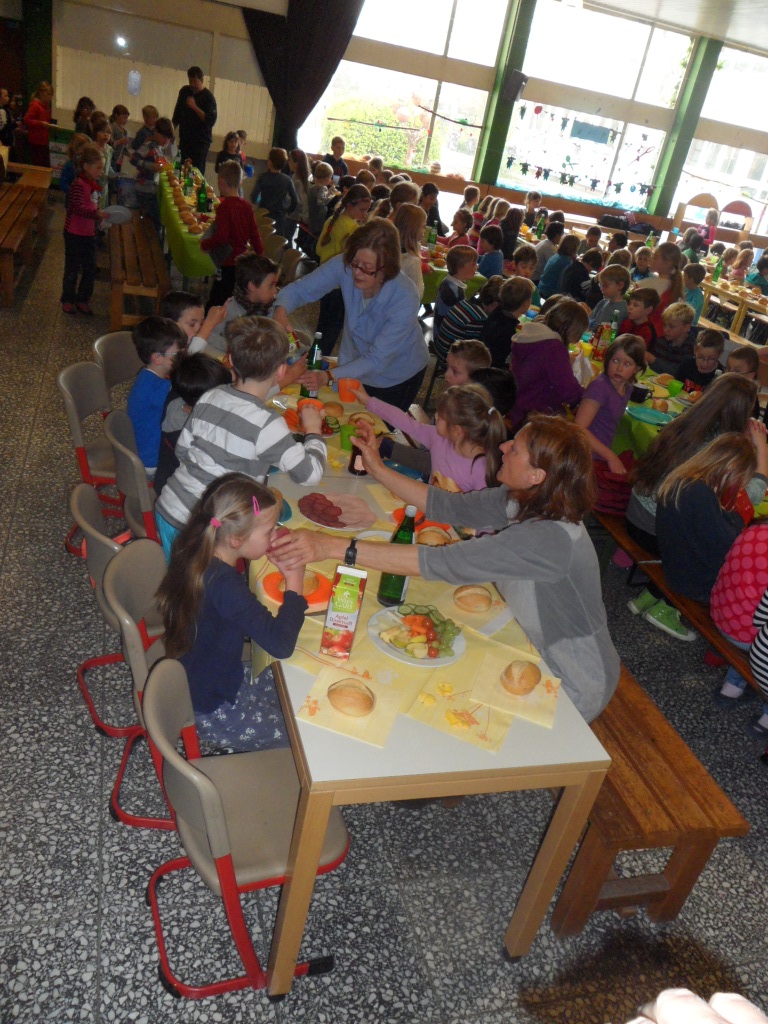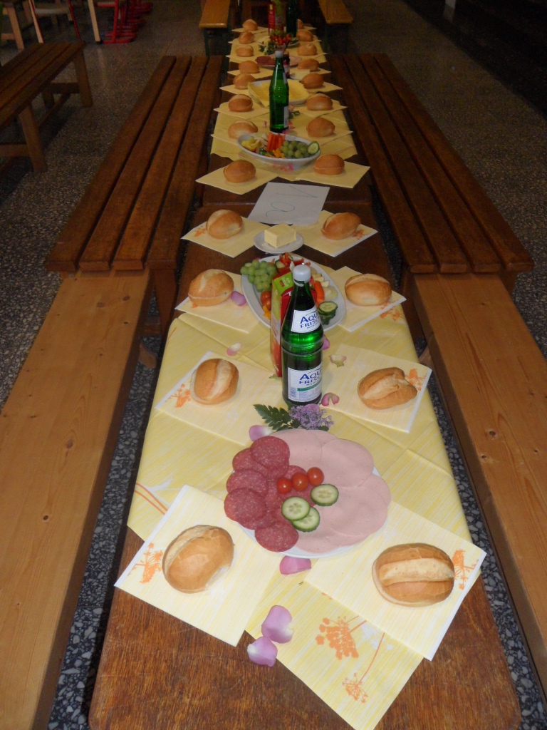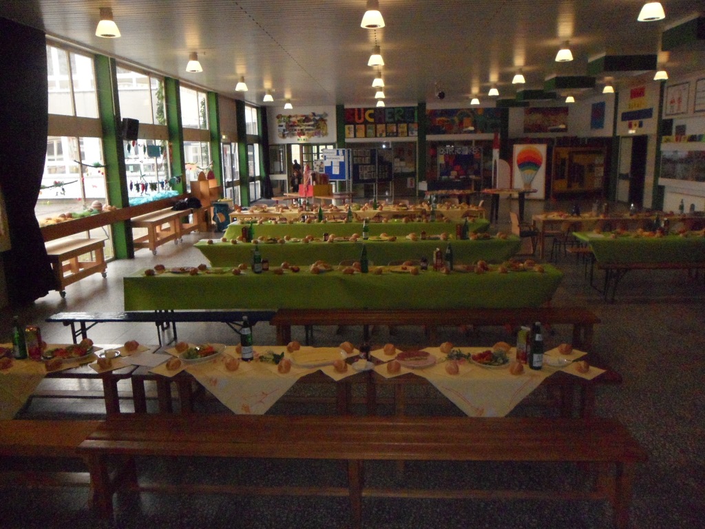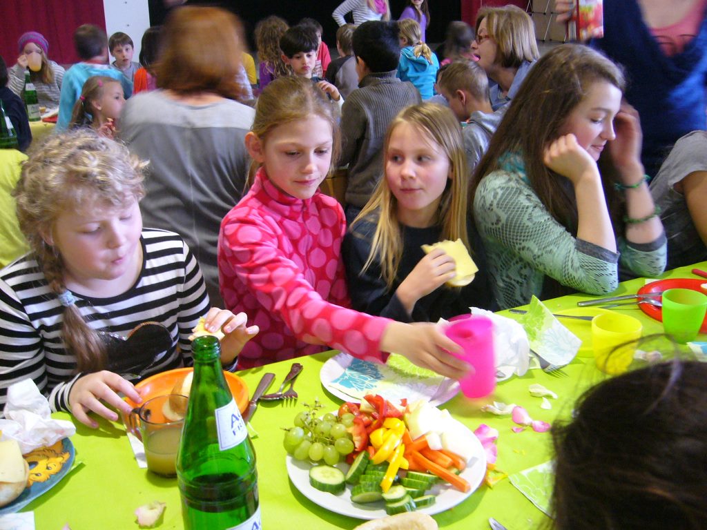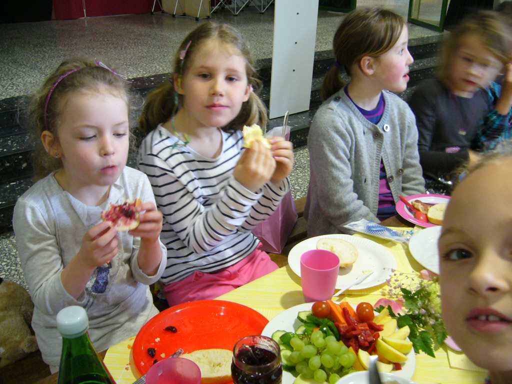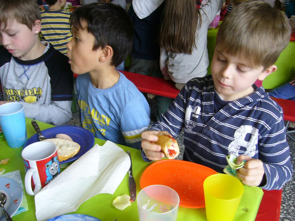 Kein Aprilscherz, am 1.4.14 fand unser diesjähriges Schulfrühstück statt. Leckere Düfte zogen durch die Schule, als sich alle Kinder und Lehrer an die liebevoll gedeckten Tische setzten. Da staunten alle sehr, als die geschnippelten Gemüse- und Obststückchen, die Käse- und Wurstteller zwischen den Rosenblättern gesichtet wurden. Dazu servierten uns viele Mütter und Väter unserer Schule Kakao und Wasser. Als Sondergast war Robert Schumann gekommen, der uns mit seiner Frühlingssinfonie in Ferienstimmung brachte. Ein großes Danke-schön an alle Helferinnen und Helfer. Mögen Sie alle frohe und gesegnete Ostern verleben!