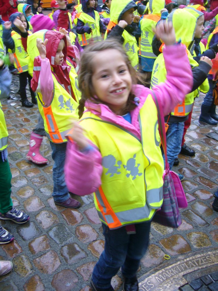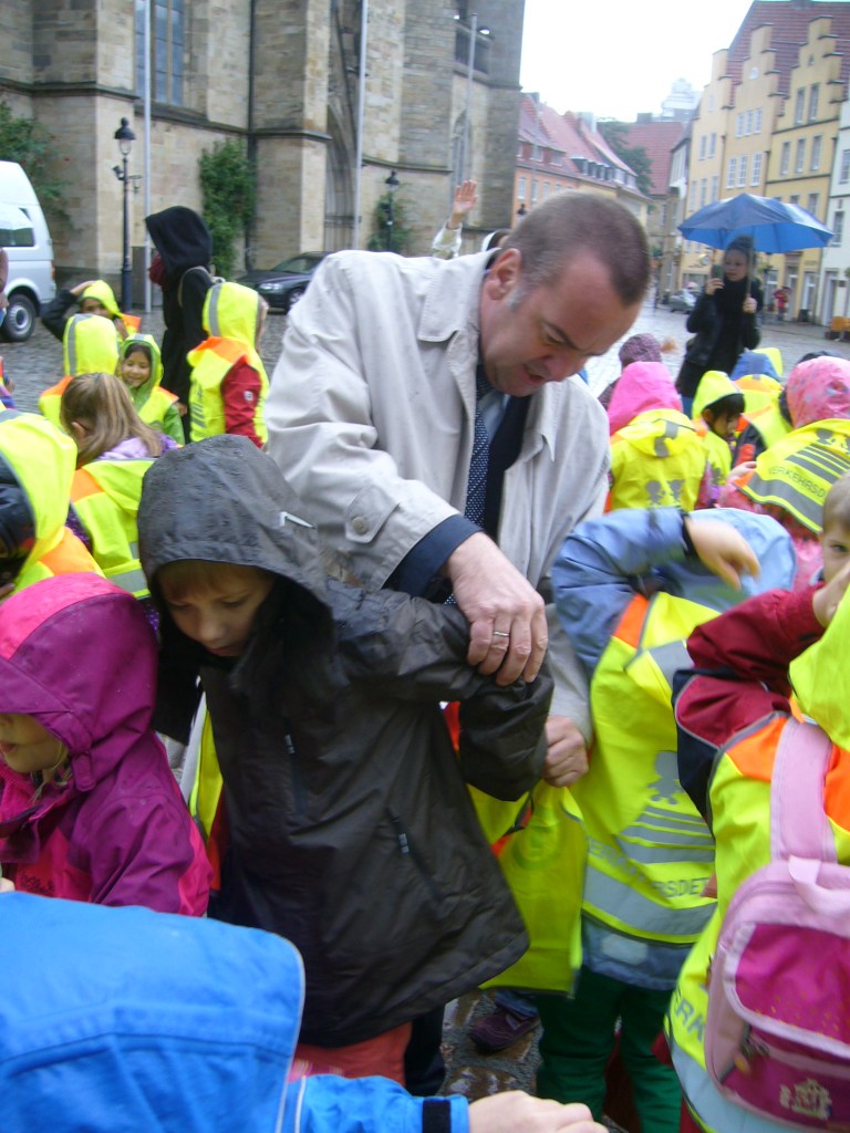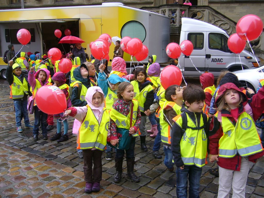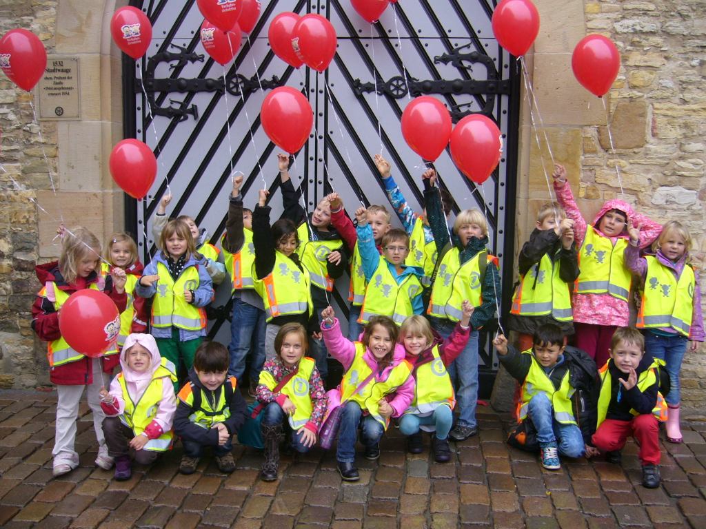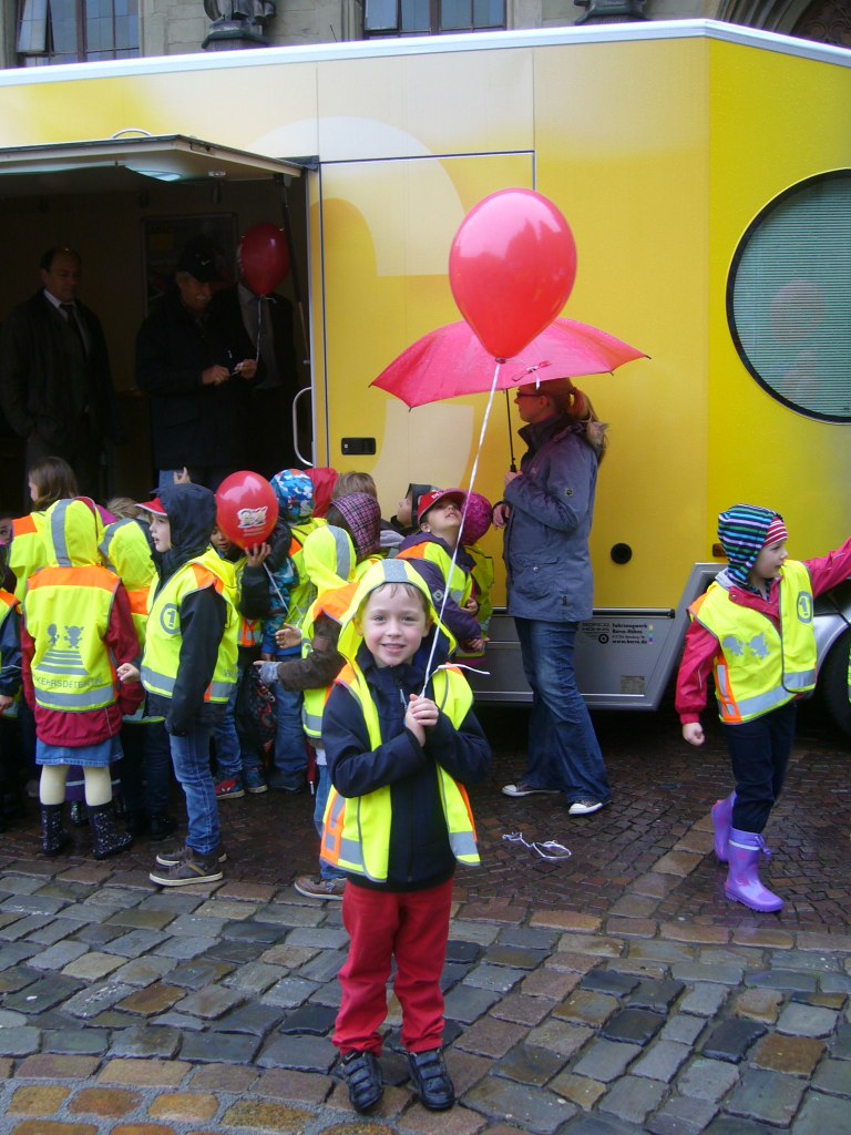 Kurz nach der Einschulung ging es für die 1a und 1b auf einen Ausflug. Unsere gemeinsame Fahrt mit dem Stadtbus war die erste spannende Aktion. Vor dem Osnabrücker Rathaus warteten wir dann, bis der Oberbürgermeister kam. Er verteilte gemeinsam mit Vertretern vom ADAC an uns die Sicherheitswesten. Anschließend durfte noch jedes Kind vorm Rathaus einen Luftballon steigen lassen.