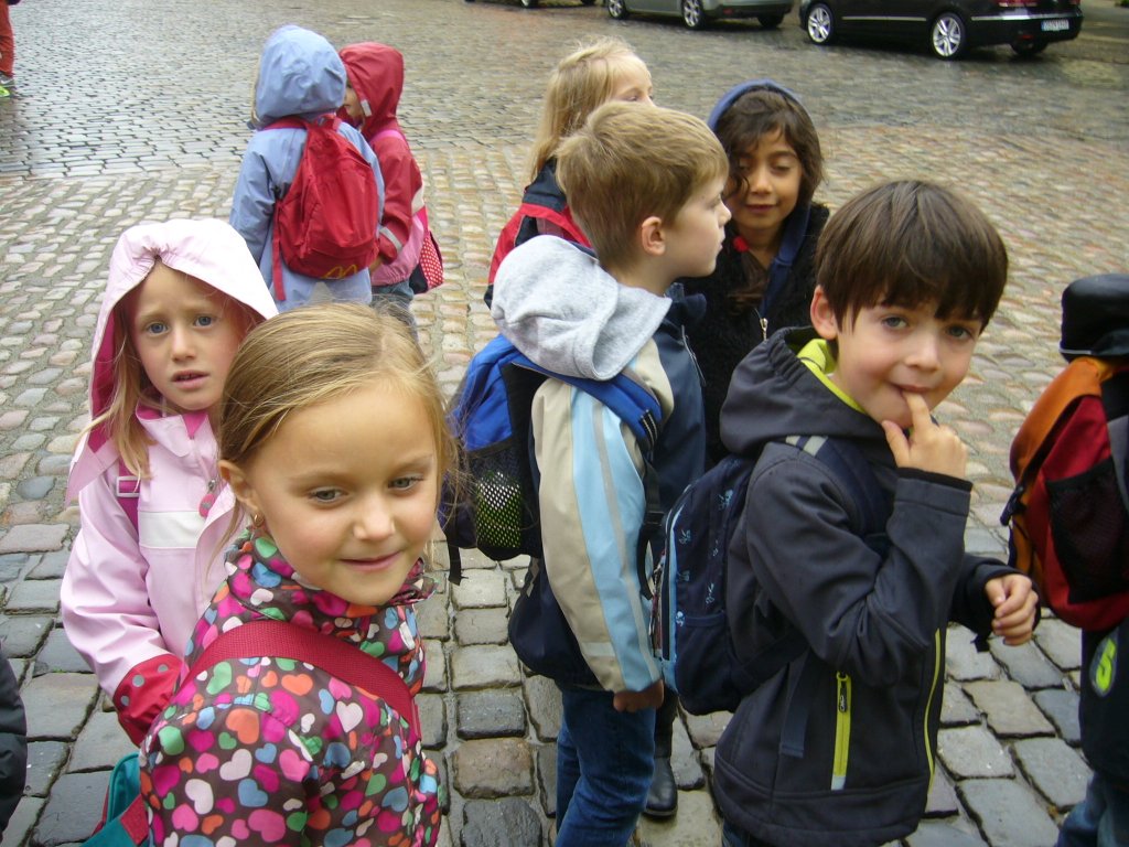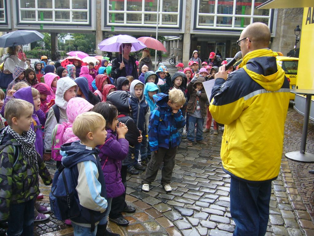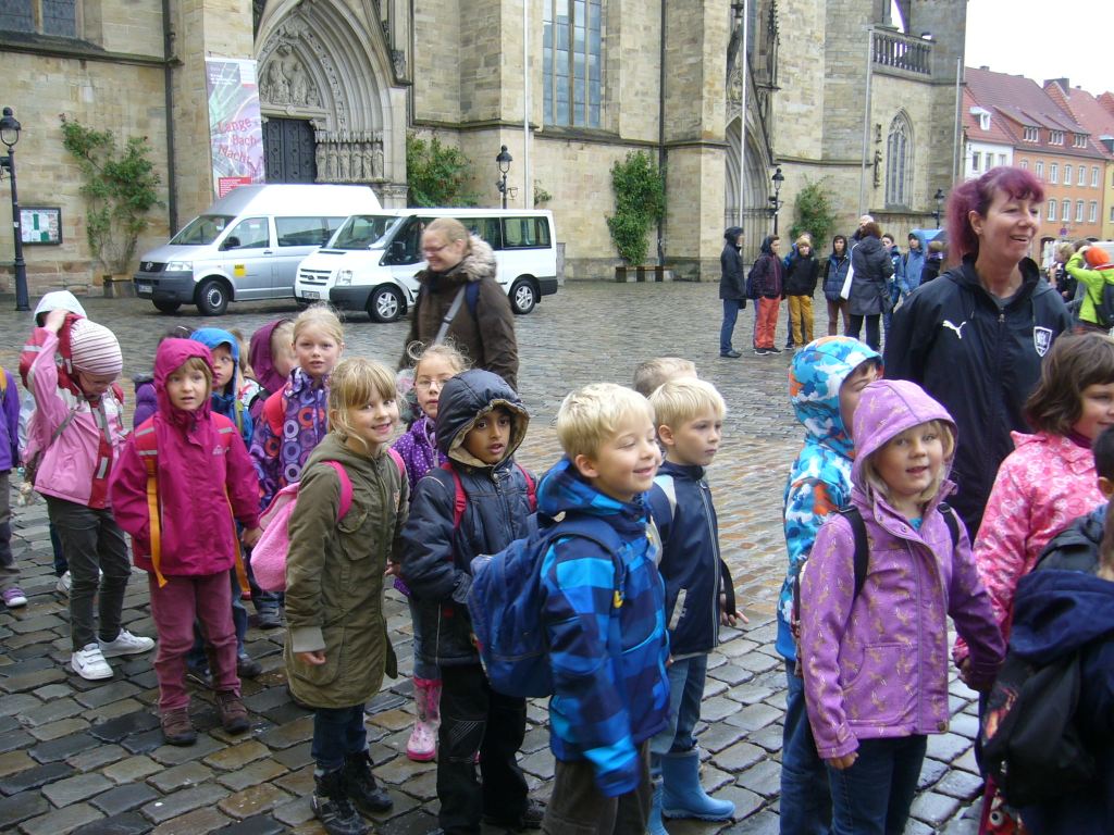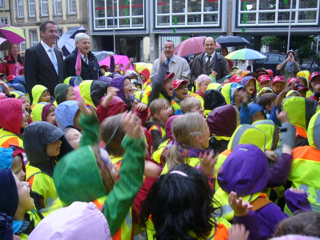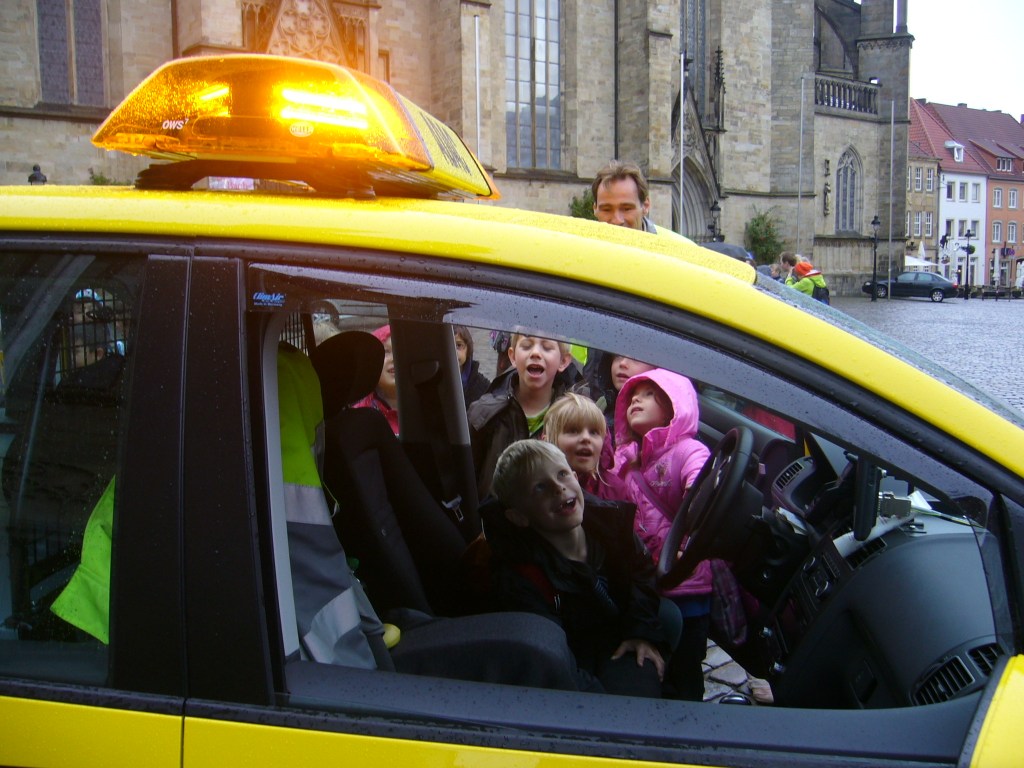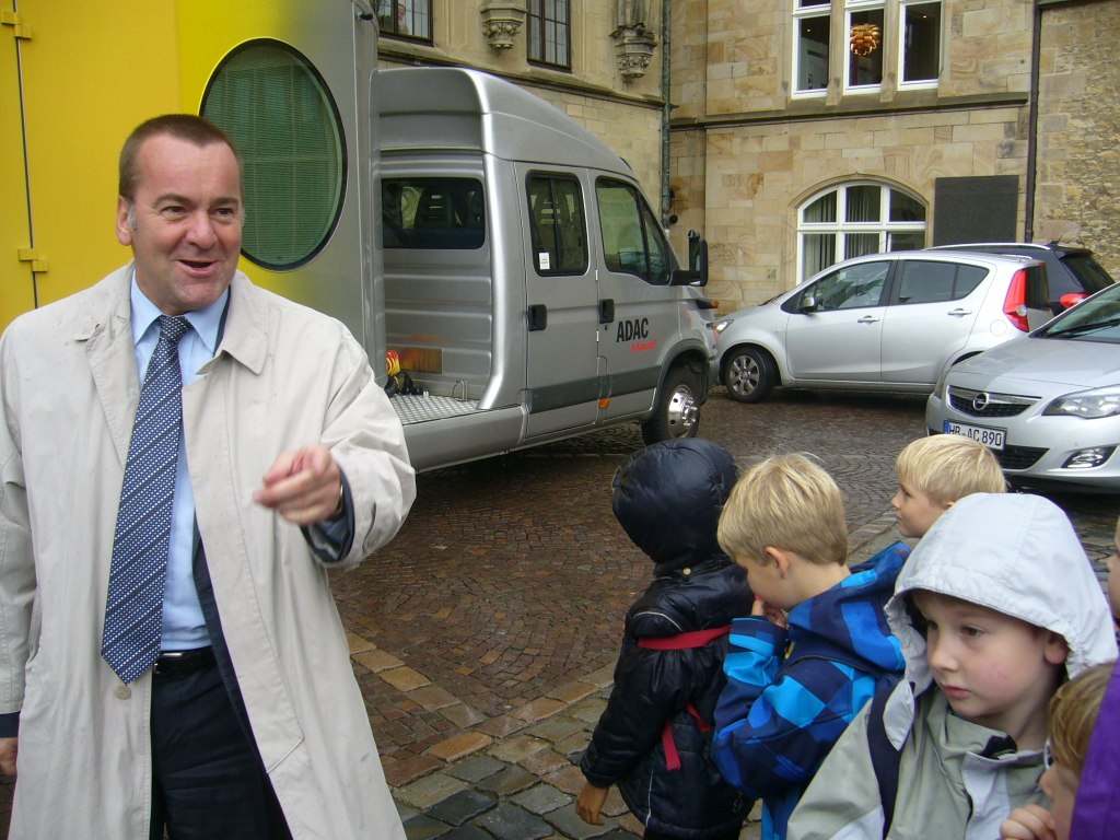Kurz nach der Einschulung ging es für die 1a und 1b auf einen Ausflug. Unsere gemeinsame Fahrt mit dem Stadtbus war die erste spannende Aktion. Vor dem Osnabrücker Rathaus warteten wir dann, bis der Oberbürgermeister kam. Er verteilte gemeinsam mit Vertretern vom ADAC an uns die Sicherheitswesten. Anschließend durfte noch jedes Kind vorm Rathaus einen Luftballon steigen lassen.
