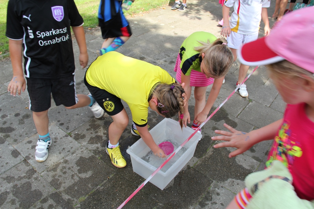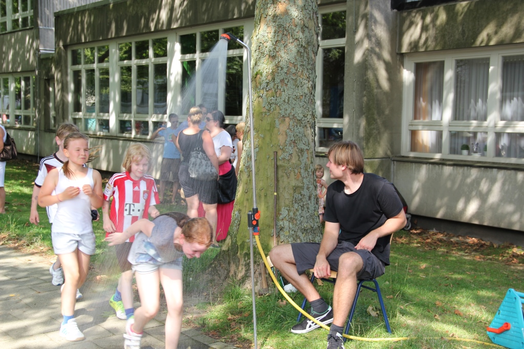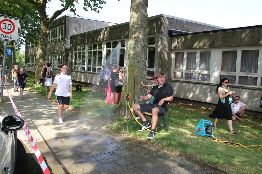 Dieses ist unseren Schülerinnen und Schülern, sowie den Eltern und Sponsoren hervorragend gelungen. Und das, obwohl das Wetter uns arg zu schaffen machte. Bei tropischen Temperaturen lief der Schweiß in Ströhmen, prima, dass Herr Hülsmann auf der Laufbahn eine kalte Dusche installierte. Welch eine herrliche Erfrischung!