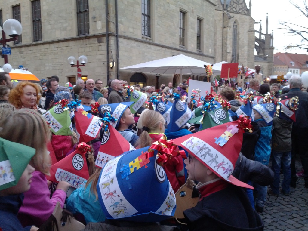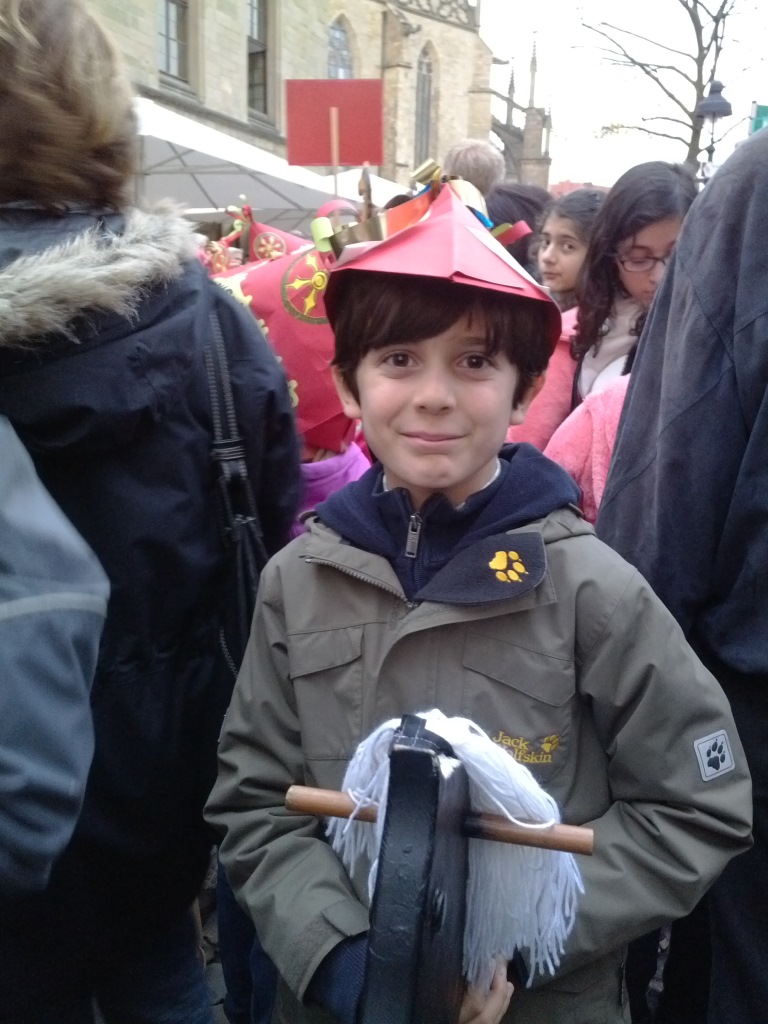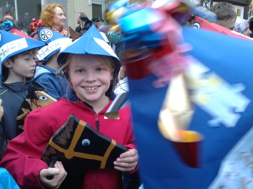 Eifrig wurden rote Hüte gefaltet und dekoriert, Lieder einstudiert und das passende Pferd ausgesucht. Viele Zuschauer begleiteten unsere Kinder auf ihrem, manchmal stockenden Weg zum Rathaus. Überall war Musik zu hören, von Bands aus den städtischen weiterführenden Schulen. Eine schöne Atmosphäre! Zum Schluss ritten die Steckenpferdreiter über die Rathaustreppe und bekamen vom neuen Oberbürgermeister eine süße Brezel. Die Brezeln sollen an die viereckigen Friedensgedächtnispfennige von Nürnberg erinnern. Abgerundet wurde der Abend durch eine Farbperformance „der Streit der Farben“ und ein Feuerwerk. Nun stehen unsere Pferde wieder im Stall und warten auf das nächste Jahr!