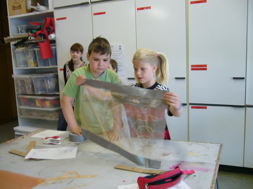 3a 13/14, Schulleben gra21. August 201421. November 2014 In Kooperation mit dem Fach „Textiles Gestalten“ der Universität Osnabrück entstanden im Textilunterricht der 3a „Windhosen“ für den Innenhof unserer Schule. Vorher sammelten die Schüler erste Erfahrungen mit dem Tapen.