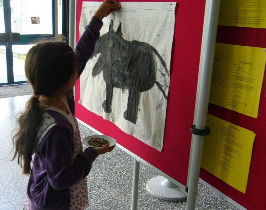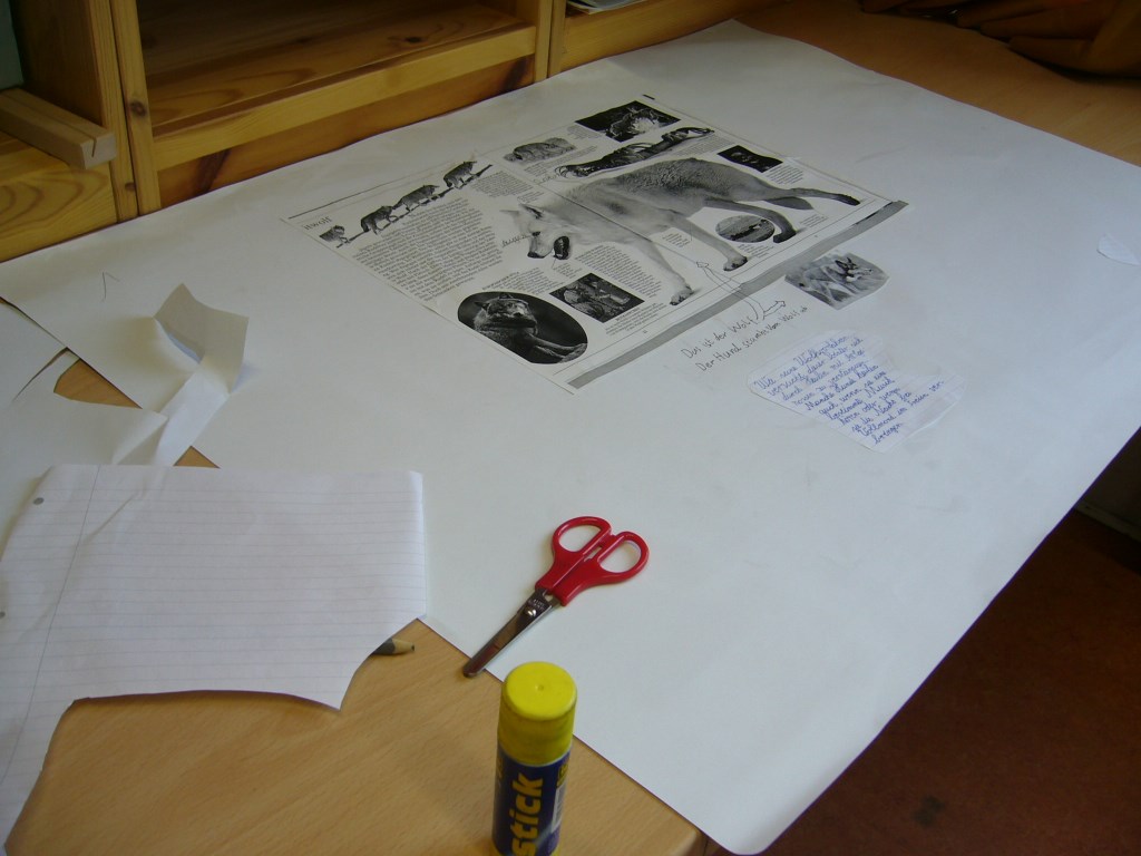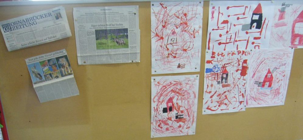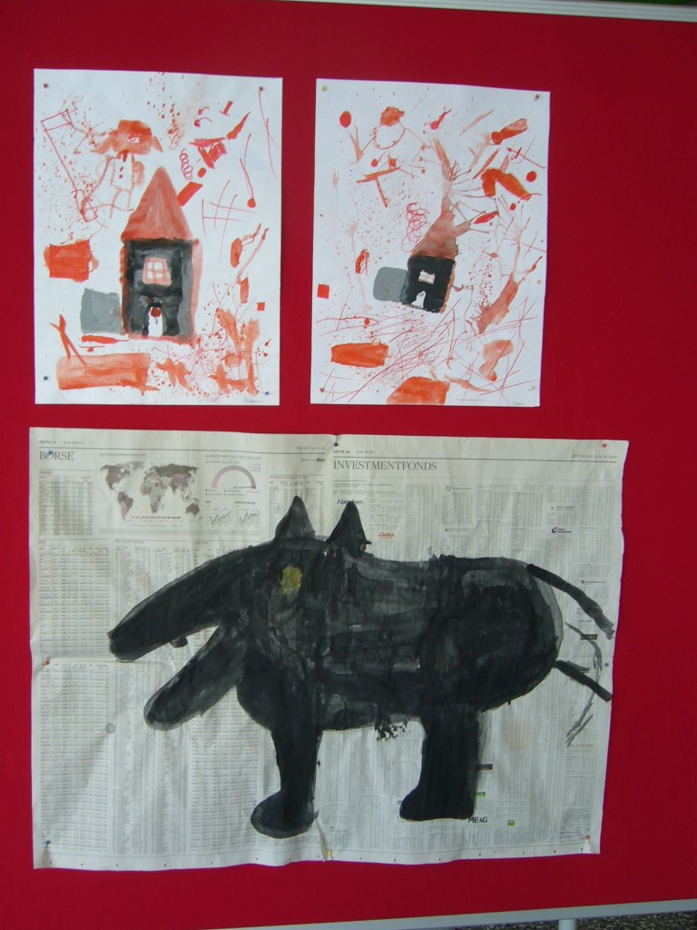 unsere „Wolfsbilder“- Wasserfarbe auf Zeitungsseiten- als Wandfries für die