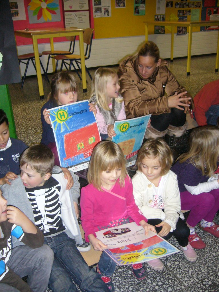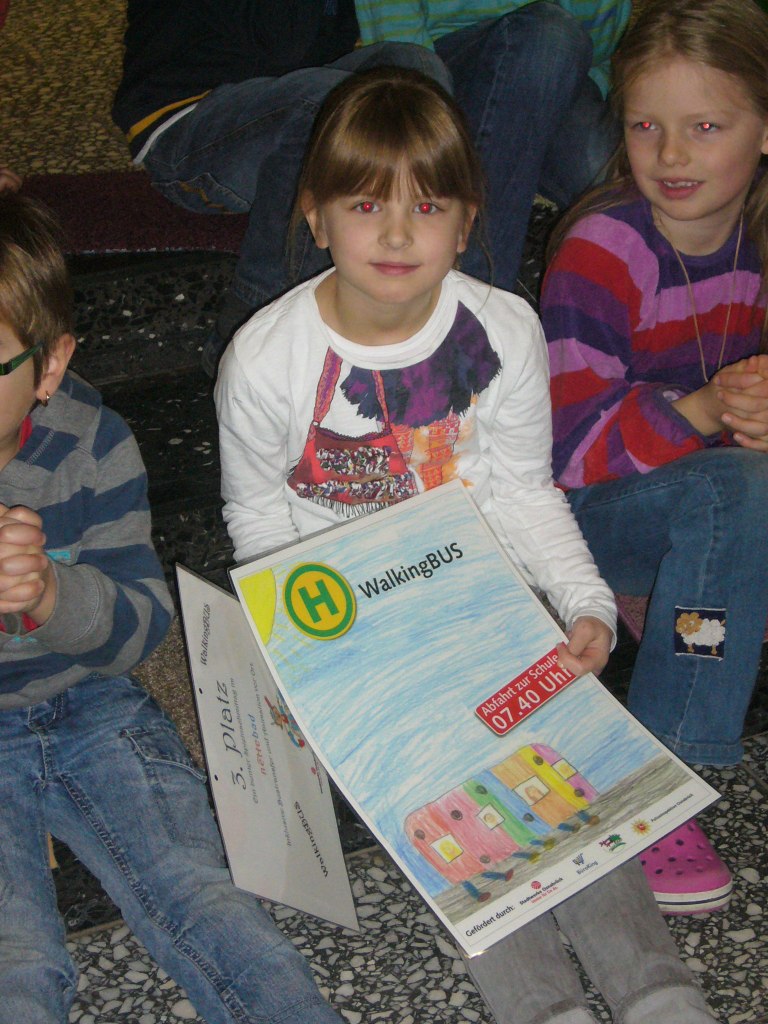 Bislang haben sich einige Eltern bereit gefunden, um die erste Linienverbindung zu gewährleisten. Frau Vennemann, eine Elternvertreterin der ersten Klasse, organisierte in Zusammenarbeit mit den Stadtwerken Osnabrück und der Polizei den Start dieses Projektes für unsere Schule. Die Stadtwerke hatten auch einen Malwettbewerb für die Haltestellen ausgerufen, und die drei besten Bilder wurden prämiert. Den dritten Preis, ein Spielenachmittag im Nettebad gewann für die Klasse 1b Nina. Den zweiten Preis, einen Ausflug mit Begleitprogramm zur Nackten Mühle gewann Romy ebenfalls für die Klasse 1b. Den ersten Preis, eine eintägige Klassenfahrt per Bus gewann Sophie für die Klasse 1a. Herzlichen Glückwunsch! Die Gewinnerbilder schmücken die “ Walking Bus“Haltestellenschilder, die die Stadtwerke aufstellten.