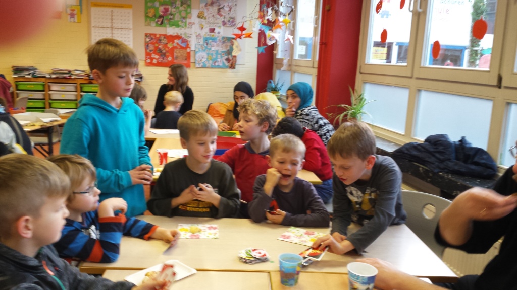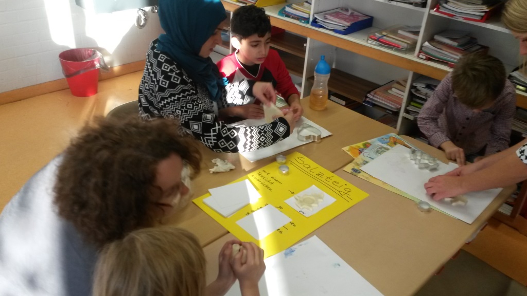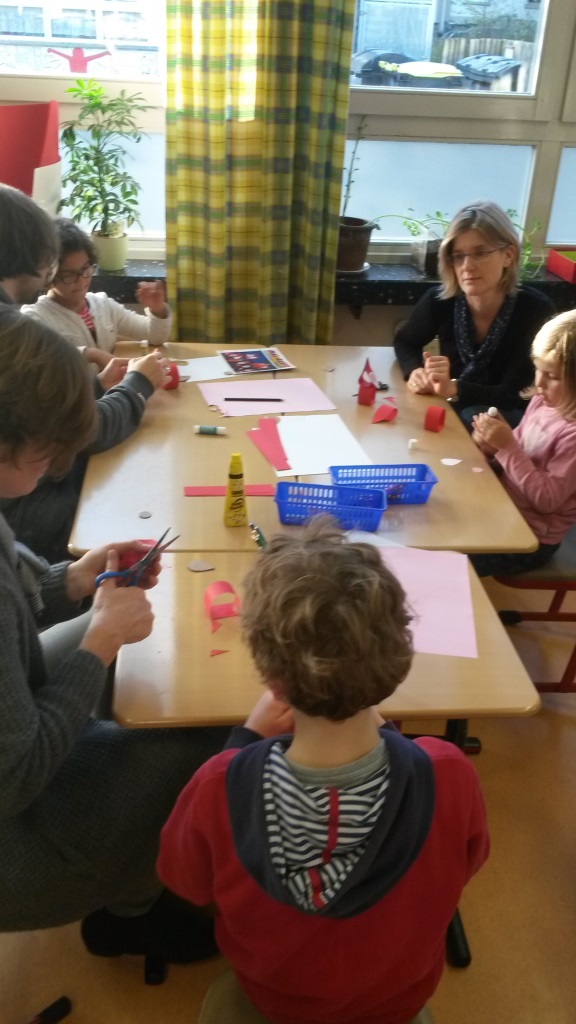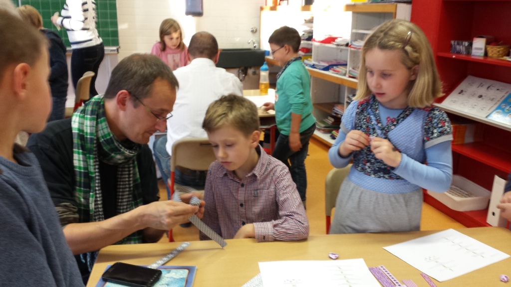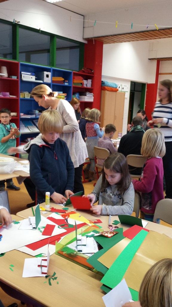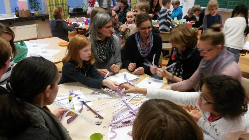 In der Vorweihnachtszeit trafen sich Lehrerinnen, Eltern und Kinder der zweiten Klassen in der Schule, um bei Kakao, Kaffee, Plätzchen und Kuchen Adventsdekorationen zu basteln. Sie erstellten mit viel Geschick Weihnachtskarten, Weihnachtsmandalas, Salzteig-Kerzenhalter, Nikolaus-Serviettenringe und Sterne. Besonderen Anklang fanden die Fröbelsterne, deren komplizierte Falttechnik von einer ehemaligen Schülerin der HSS mit viel Geduld angeleitet wurde. Wer keine Lust auf basteln hatte, konnte sich in einem anderen Klassenraum mit kleineren Gesellschaftsspiele vergnügen oder sich gemütlich unterhalten.
